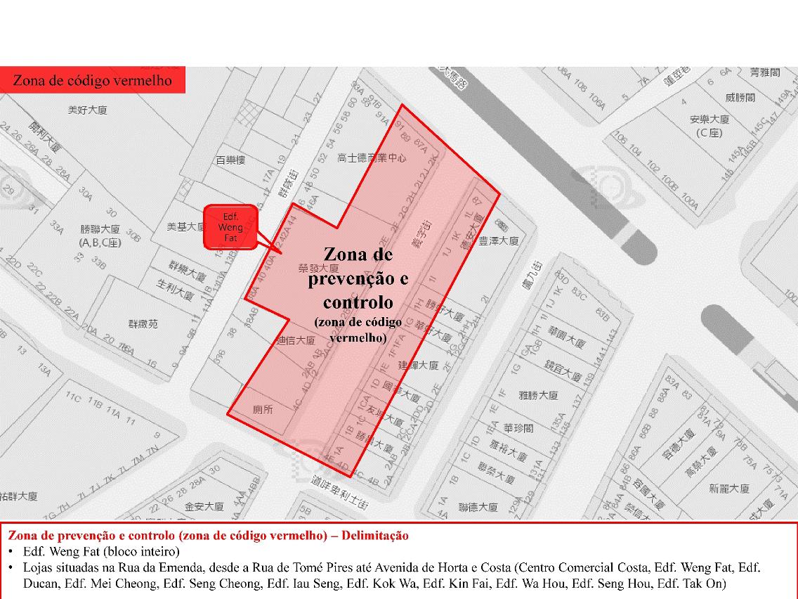 O plano de gestão de prevenção e controlo da epidemia por categorias e zonas irá delimitar determinadas zonas, conforme o local de surgimento de casos confirmados e das áreas com possibilidade de propagação. A zona de código vermelho (zona de prevenção e controlo), necessita de uma gestão fechada de alto risco, enquanto que a zona de código amarelo (zona de gestão mútua), necessita de uma gestão de controlo com um risco relativamente alto. Actualmente, os edifícios que se encontram na zona de código vermelho são: Edifício Mei Lin (local onde surgiu casos confirmados) e os outros dois edifícios adjacentes, Edifício Fai Son e Edifício Kian On. Ainda, as lojas na Rua da Emenda e Edifício Weng Fat estão definidas como zona de gestão de controlo. Estas foram incluidas numa gestão fechada com restrições totais onde os residentes estão sujeitos, de acordo com a situação real, a observação médica no local ou a serem transportados para outro local adequado onde ficam submetidos a observação médica. As outras medidas adoptadas incluem a realização, no local, de testes de ácido nucleico, que por enquanto serão feitos nos 1.º, 3.º e 5.º dias. Para além dos funcionários, todos os indivíduos que entrarem na zona estão proibídos de sair, com excepção da deslocação ao local designado para levantar bens essenciais providenciados pelo governo.