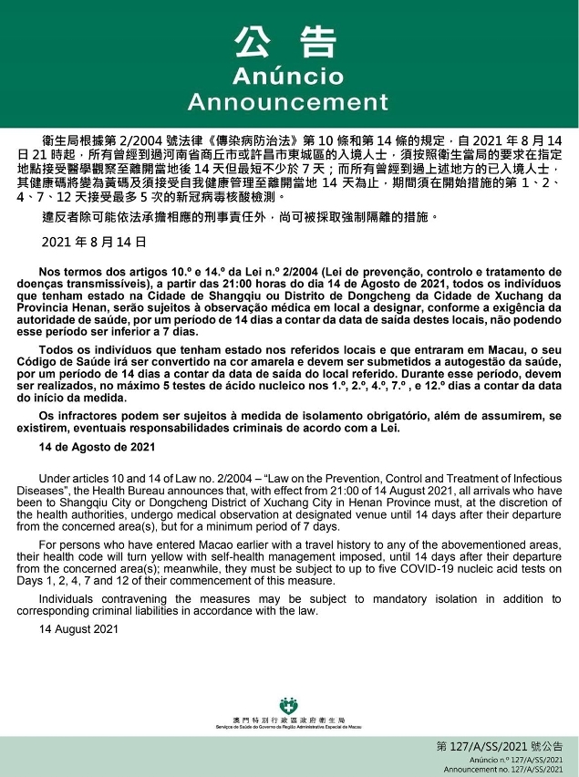 O Centro de Coordenação de Contingência do Novo Tipo de Coronavírus informa que tendo em consideração a evolução epidemiológica mais actualizada na Província de Henan, nos termos dos artigos 10.º e 14.º da Lei n.º 2/2004 (Lei de prevenção, controlo e tratamento de doenças transmissíveis), a partir das 21:00 horas do dia 14 de Agosto de 2021, todos os indivíduos que tenham estado na Cidade de Shangqiu ou Distrito de Dongcheng da Cidade de Xuchang da Provincia Henan, serão sujeitos à observação médica em local a designar, conforme a exigência da autoridade de saúde, por um período de 14 dias a contar da data de saída dos locais referidos, não podendo esse período ser inferior a 7 dias.