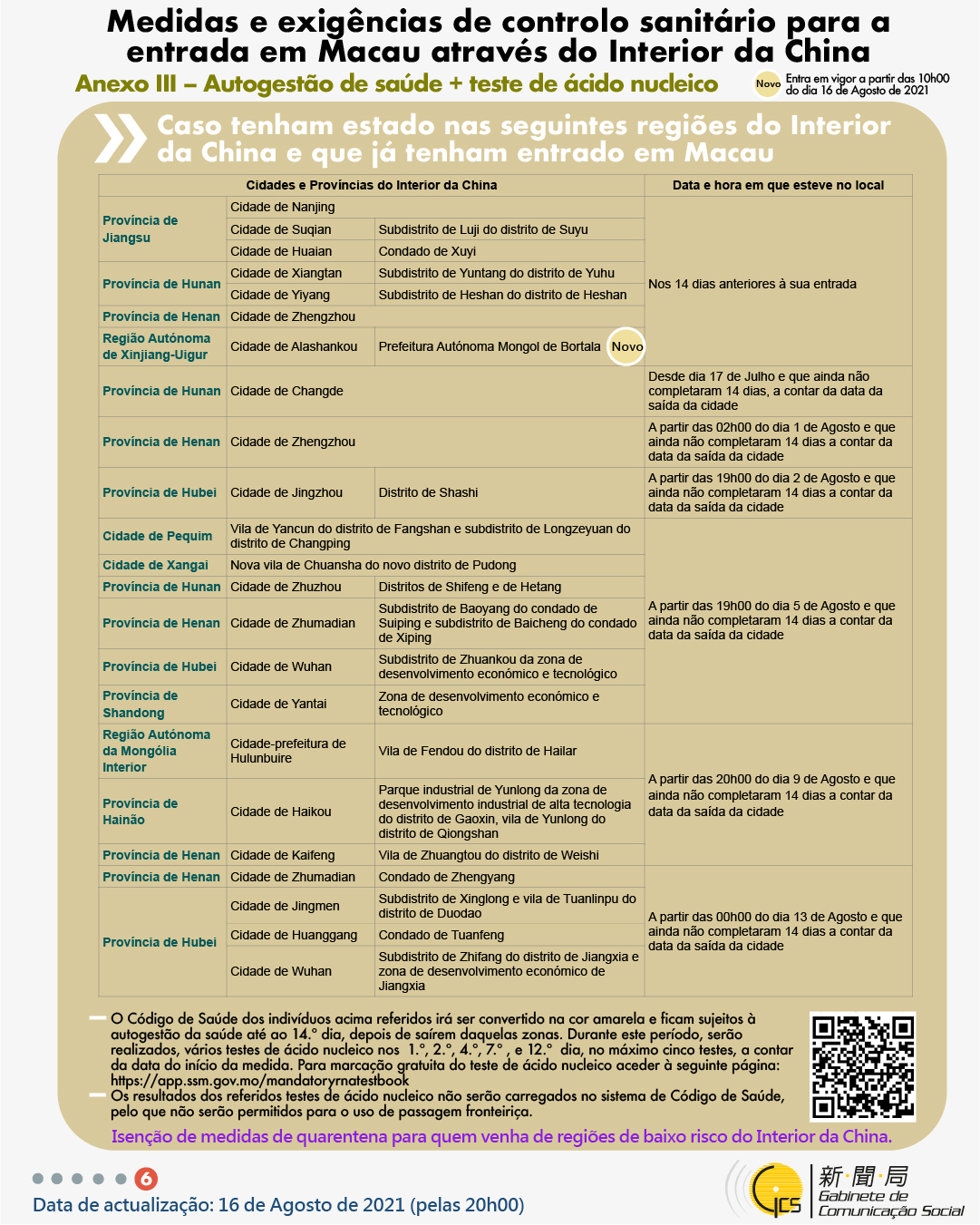 (Infografia)Medidas e exigências de controlo sanitário para a entrada em Macau de indivíduos de diferentes identidades, actualizadas no dia 16 de Agosto de 2021
