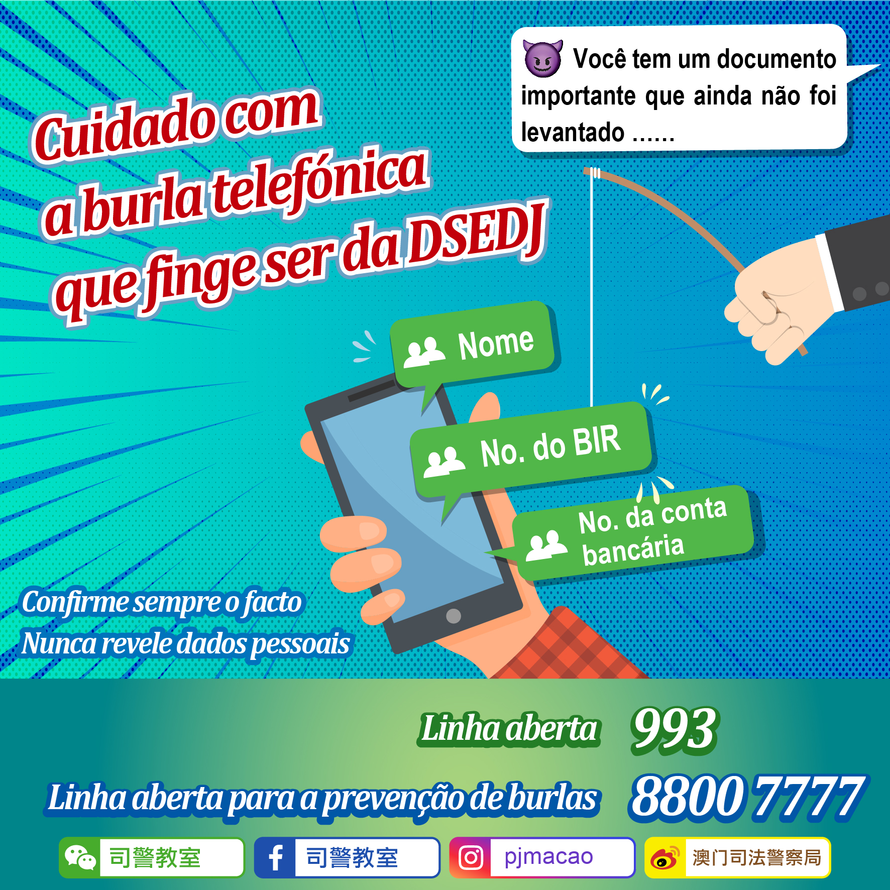 Hoje, a PJ foi informada pela Direcção dos Serviços de Educação e de Desenvolvimento da Juventude um cidadão recebeu uma gravação de som, através do seu telemóvel, dizendo que “um documento importante da DSEDJ ainda não foi levantado”. O mesmo cidadão suspeitou da chamada e desligou imediatamente e, no dia seguinte, telefonou para a DSEDJ para confirmar tal chamada, tendo-lhe sido dito a mesma não é verdadeira.