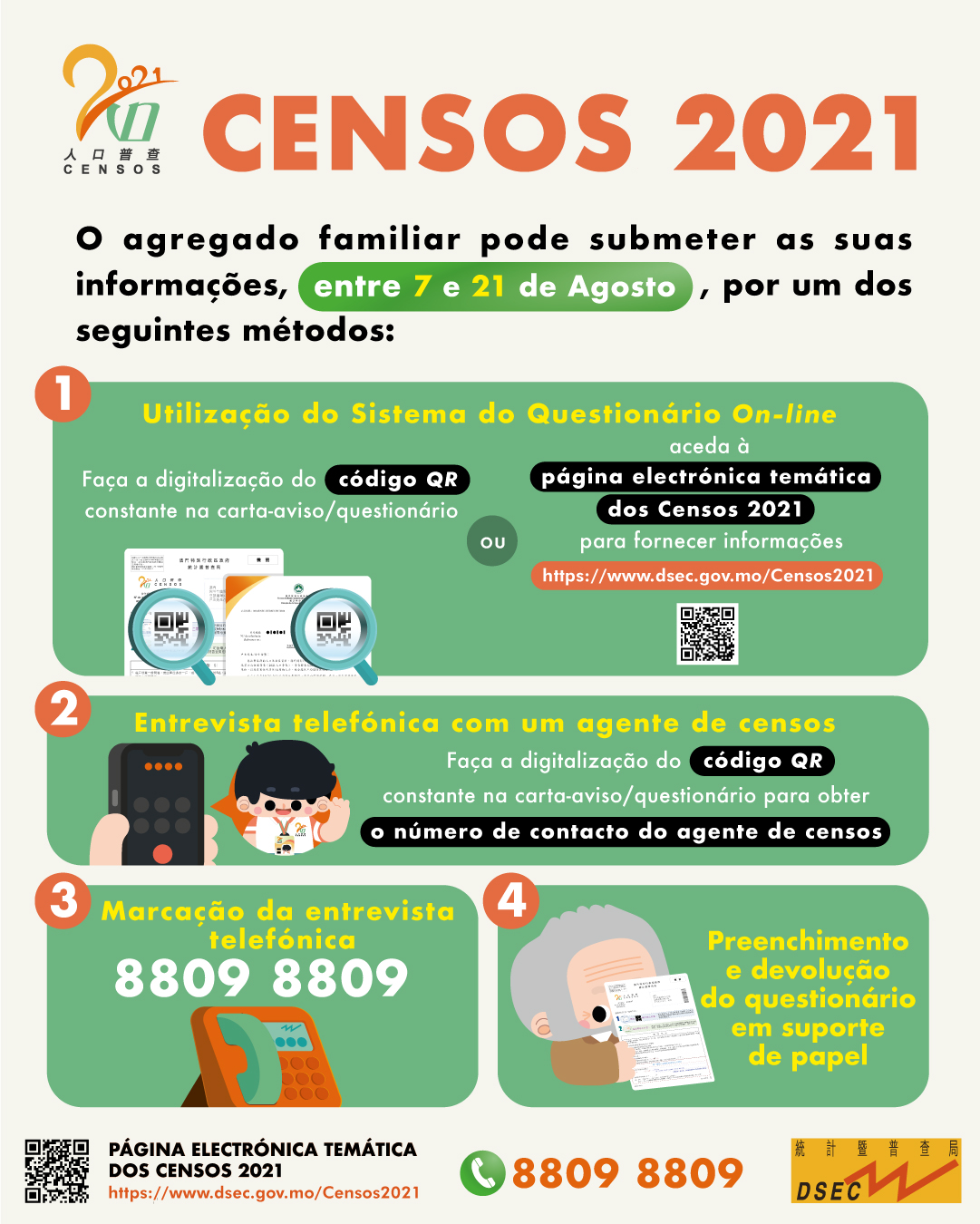 Para mais pormenores sobre os Censos, queira aceder à página electrónica temática dos Censos 2021: https://www.dsec.gov.mo/Censos2021, ou ligar para a linha azul dos Censos 8809 8809.