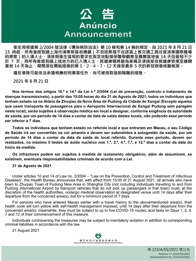 O Centro de Coordenação de Contingência do Novo Tipo de Coronavírus informa que tendo em consideração a evolução epidemiológica mais actualizada na Cidade de Xangai, nos termos dos artigos 10.º e 14.º da Lei n.º 2/2004 (Lei de prevenção, controlo e tratamento de doenças transmissíveis), a partir das 15:00 horas do dia 21 de Agosto de 2021, todos os indivíduos que tenham estado na Aldeia de Zhuqiao da Nova Área de Pudong da Cidade de Xangai (Excepto aqueles que usem transporte de passageiros para o Aeroporto Internacional de Xangai Pudong sem paragem neste local), serão sujeitos à observação médica em local a designar, conforme a exigência da autoridade de saúde, por um período de 14 dias a contar da data de saída dos locais referidos, não podendo esse período ser inferior a 7 dias.