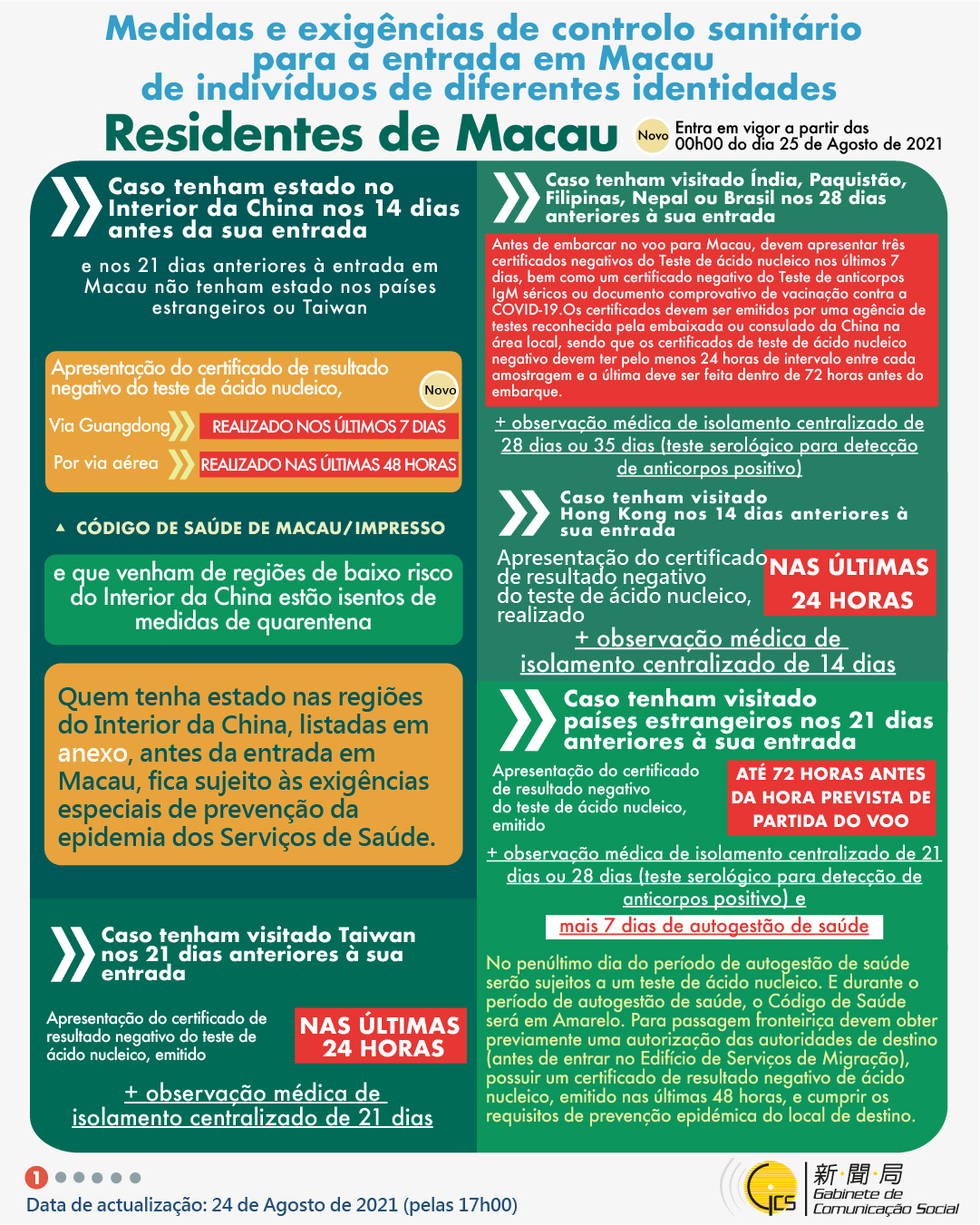 (Infografia)Medidas e exigências de controlo sanitário para a entrada em Macau de indivíduos de diferentes identidades, actualizadas no dia 24 de Agosto de 2021