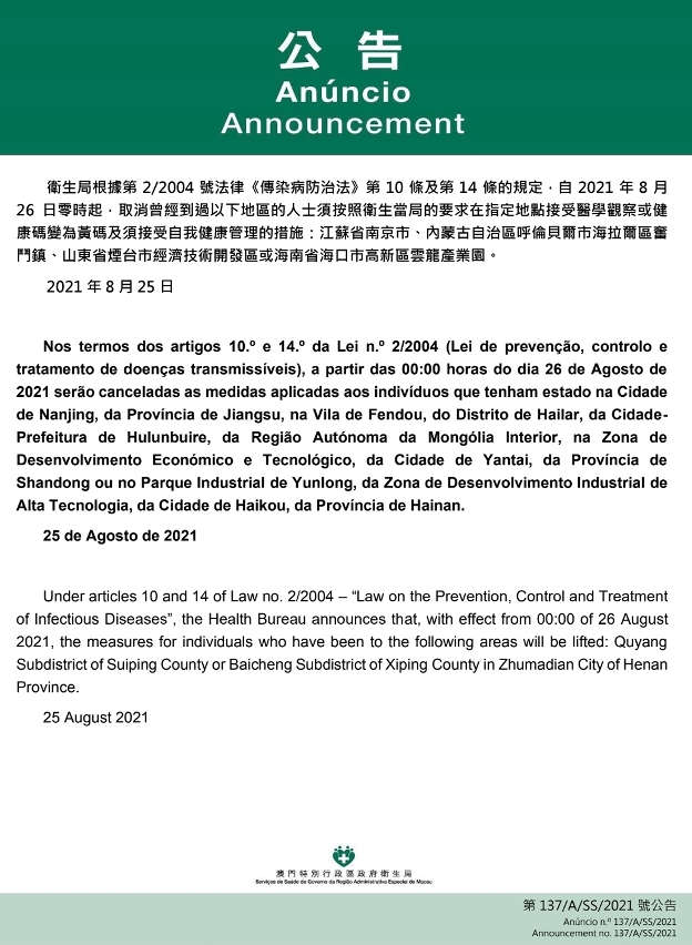 O Centro de Coordenação de Contingência do Novo Tipo de Coronavírus informa que tendo em consideração a evolução epidemiológica mais actualizada nas Províncias de Jiangsu, de Shandong, de Hainan e da Região Autónoma da Mongólia Interior, nos termos dos artigos 10.º e 14.º da Lei n.º 2/2004 (Lei de prevenção, controlo e tratamento de doenças transmissíveis), a partir das 00:00 horas do dia 26 de Agosto de 2021, serão canceladas as medidas aplicadas aos indivíduos que tenham estado na Cidade de Nanjing, da Província de Jiangsu, na Vila de Fendou, do Distrito de Hailar, da Cidade-Prefeitura de Hulunbuire, da Região Autónoma da Mongólia Interior, na Zona de Desenvolvimento Económico e Tecnológico, da Cidade de Yantai, da Província de Shandong ou no Parque Industrial de Yunlong, da Zona de Desenvolvimento Industrial de Alta Tecnologia, da Cidade de Haikou, da Província de Hainan.
