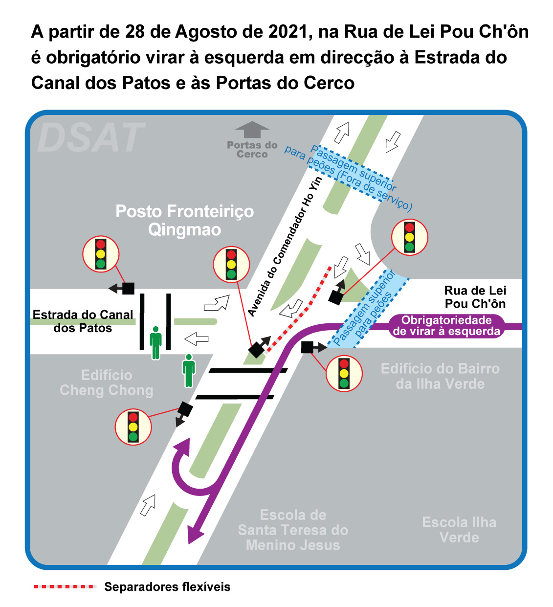 Para optimizar as instalações complementares aos transportes junto ao Posto Fronteiriço Qingmao e para elevar a segurança rodoviária, a Direcção dos Serviços para os Assuntos de Tráfego (DSAT) instalou sinalização luminosa no cruzamento da Avenida do Comendador Ho Yin com a Estrada do Canal dos Patos e a Rua de Lei Pou Ch’ôn, cancelando, em paralelo, as bandas em zebra instaladas no local. Informam-se os peões de que podem usar a passagem para peões equipada com sinalização luminosa ou a passagem superior para peões. Os veículos que circulem da Rua de Lei Pou Ch’ôn em direcção à Estrada do Canal dos Patos e às Portas do Cerco, deverão virar à esquerda para a Avenida do Comendador Ho Yin e inverter o sentido de marcha junto da Escola de Santa Teresa.