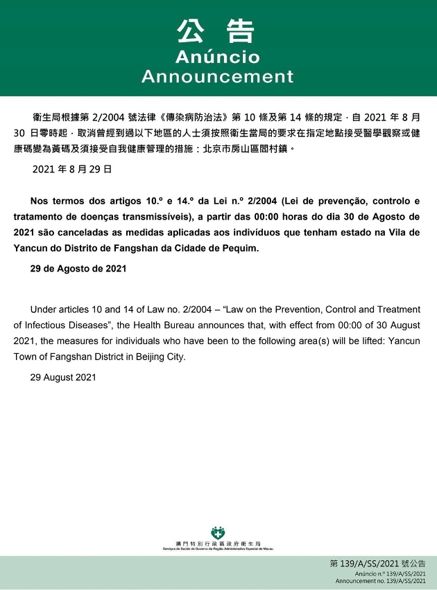 O Centro de Coordenação de Contingência do Novo Tipo de Coronavírus informa que tendo em consideração a evolução epidemiológica mais actualizada na Cidade de Pequim, nos termos dos artigos 10.º e 14.º da Lei n.º 2/2004 (Lei de prevenção, controlo e tratamento de doenças transmissíveis), a partir das 00:00 horas do dia 30 de Agosto de 2021, serão canceladas as medidas aplicadas aos indivíduos que tenham estado na Vila de Yancun do Distrito de Fangshan da Cidade de Pequim.