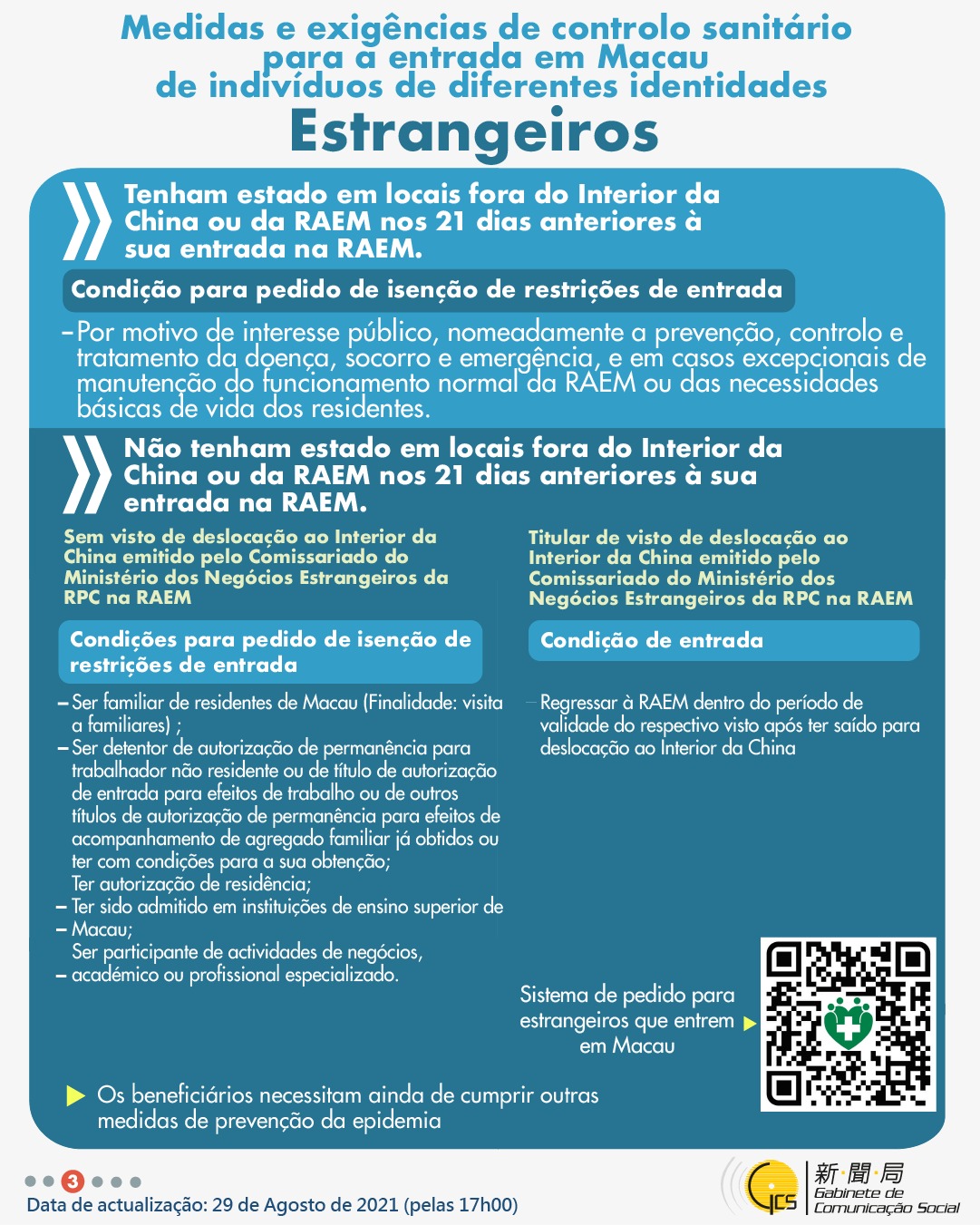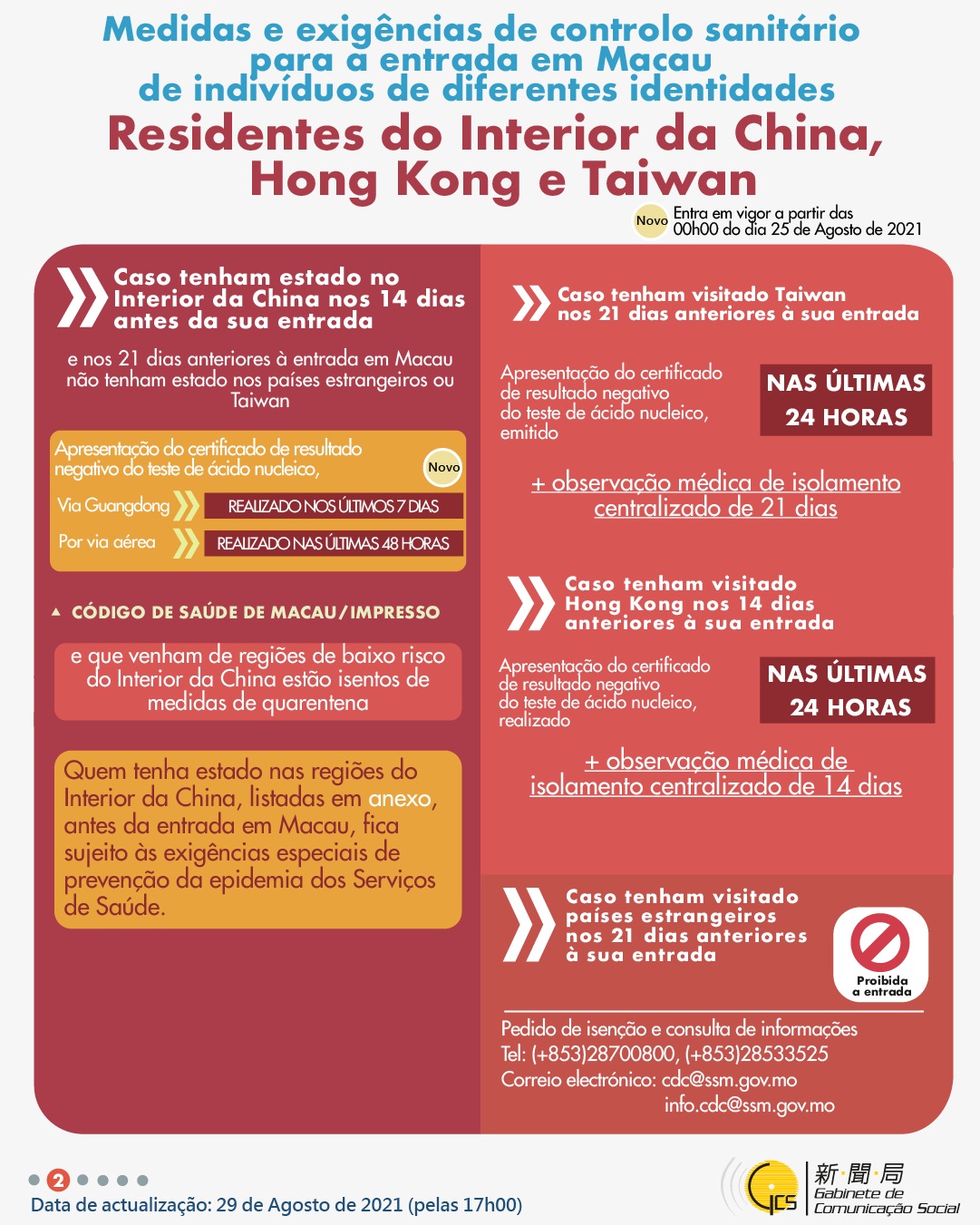 (Infografia)Medidas e exigências de controlo sanitário para a entrada em Macau de indivíduos de diferentes identidades, actualizadas no dia 29 de Agosto de 2021