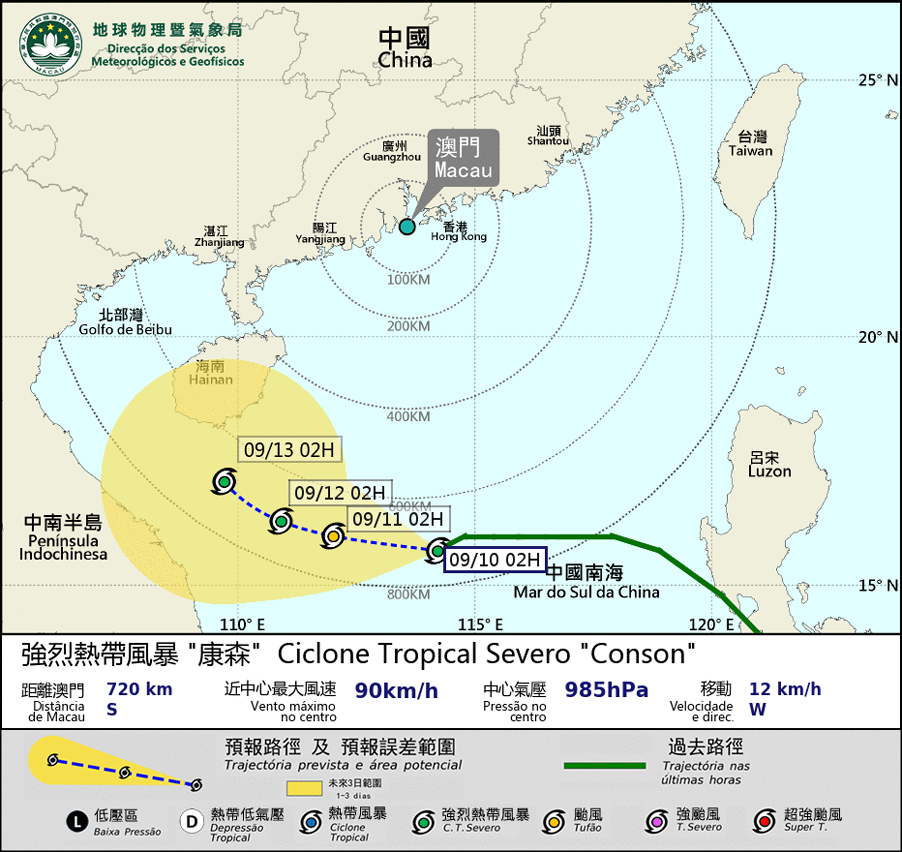O Ciclone Tropical Severo “Conson” vai mover-se para oeste e atravessar o Mar do Sul da China nos próximos dias. Ao fim de semana, o sistema vai aproximar-se da zona adjacente da Ilha “Hainan. Visto que o “Conson” se encontra a uma distância superior a 600 km de Macau, a menos que tome um rumo mais Norte ou se intensifique rapidamente, a hipótese de emitir o sinal mais alto é relativamente baixa. Além disso, nos próximos dias, o Super Tufão “Chanthu” localizado na parte noroeste do Oceano Pacífico vai continuar a mover-se para a zona próximo de “Taiwan”. Uma vez que nos próximos dias Macau não se encontra na fase alta da maré astronómica e os ciclones tropicais mantêm distância de Macau, a possibilidade de inundações causadas por “Storm Surge” é baixa.