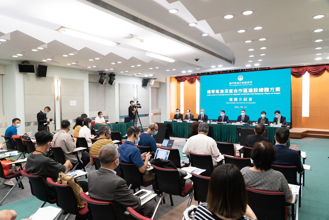 Teve lugar no dia 14 de Setembro, na Sala Polivalente da Sede do Governo, a segunda sessão de apresentação à imprensa sobre o Projecto Geral de Construção da Zona de Cooperação Aprofundada entre Guangdong e Macau em Hengqin, na qual o Secretário para a Economia e Finanças, acompanhado pelos dirigentes dos serviços públicos da sua tutela, fez uma apresentação sobre o referido projecto, na parte referente às áreas da economia e finanças.