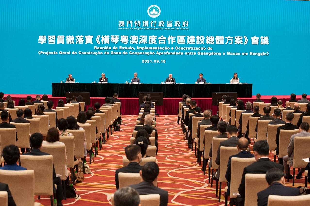 O Chefe do Executivo, Ho Iat Seng, presidiu hoje (18 de Setembro), a reunião de estudo, implementação e concretização do «Projecto Geral de Construção da Zona de Cooperação Aprofundada entre Guangdong e Macau em Hengqin», vulgo «Projecto Geral», realizada esta manhã, às 10h00, no Complexo da Plataforma de Serviços para a Cooperação Comercial entre a China e os Países de Língua Portuguesa.