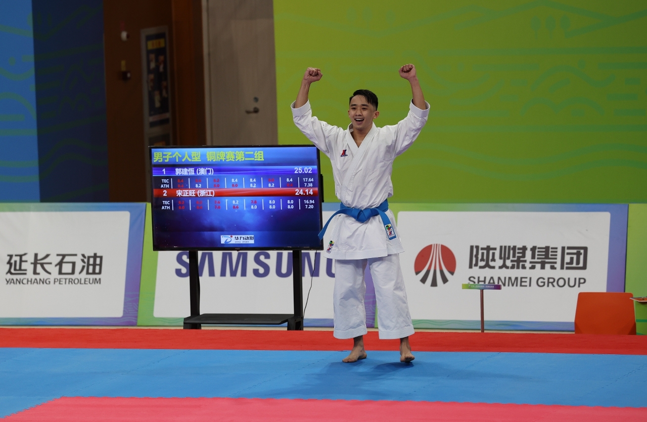 A delegação desportiva da RAEM está a participar nos 14.ºs Jogos Nacionais da República Popular da China na cidade Xian da província Shaanxi. Hoje (dia 18) o atleta de karate-do de Macau, Kuok Kin Hang, obteve o resultado de 25.02 na modalidade de kata individual masculino e conquistou a medalha de bronze, sendo a primeira medalha que a delegação de Macau conseguiu obter nos Jogos Nacionais desta edição, assim como a primeira medalha que Macau conseguiu obter desde a participação nos Jogos Nacionais.
