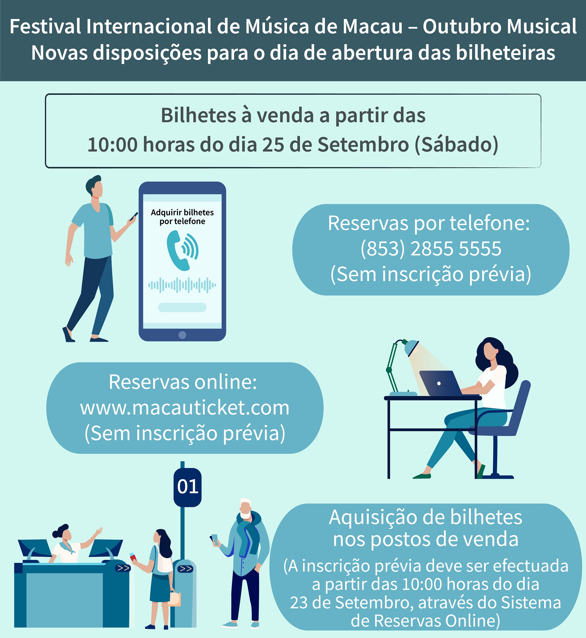 O Festival Internacional de Música de Macau – Outubro Musical, organizado pelo Instituto Cultural, irá decorrer, durante o mês de Outubro, e, no próximo dia 25 de Setembro (Sábado), os bilhetes estarão oficialmente à venda, a partir das 10:00 horas, na Bilheteria Online de Macau. Por forma a colaborar com os trabalhos de prevenção da pandemia e assegurar a saúde dos residentes, a partir das 10:00 do primeiro dia de venda, os bilhetes estarão disponíveis em simultâneo nos postos de venda da Bilheteira Online de Macau, por telefone e por reserva online. Além disso, com o intuito de reduzir o fluxo e as filas de espera de pessoas na aquisição presencial de bilhetes, será aberto ao público o Sistema de Reservas Online para fins de compra de bilhetes no primeiro dia. Os interessados que pretendam adquirir os seus bilhetes presencialmente, entre as 10:00 e as 12:00 horas do dia de abertura das bilheteiras, nos locais habituais da Bilheteira Online de Macau, devem efectuar a respectiva inscrição prévia e seleccionar o local e o horário específicos, para aquisição e levantamento, no Sistema de Reservas Online da Bilheteira Online de Macau, a partir das 10:00 do dia 23 de Setembro (Quinta-Feira).