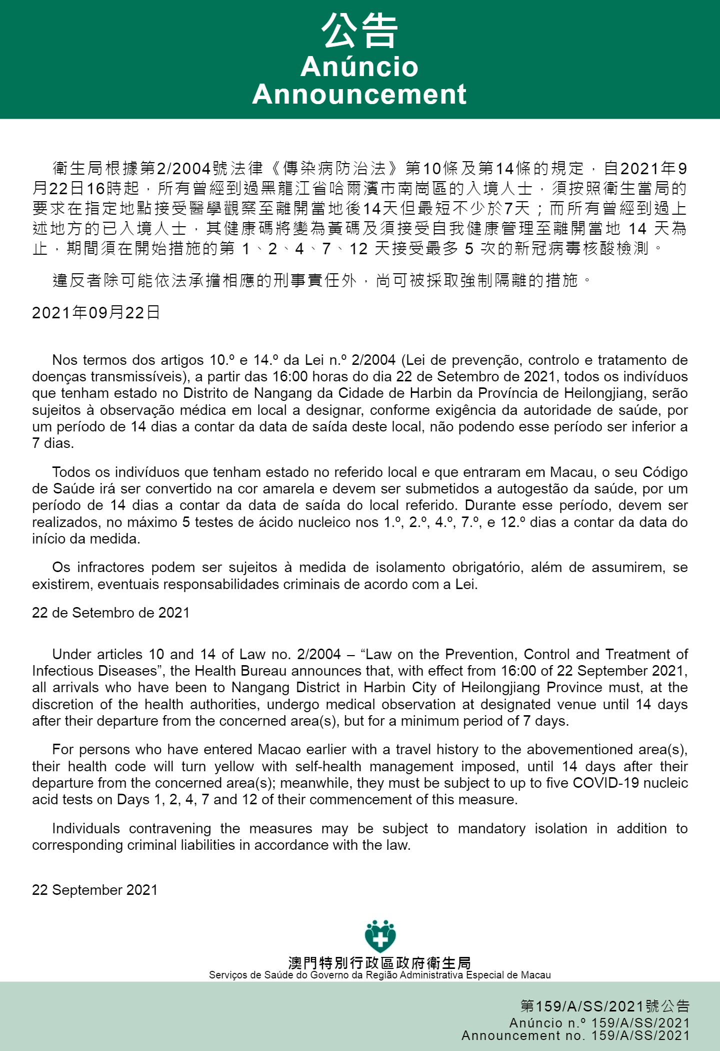O Centro de Coordenação de Contingência do Novo Tipo de Coronavírus informa que tendo em consideração a evolução epidemiológica mais actualizada na Província de Heilongjiang, nos termos dos artigos 10.º e 14.º da Lei n.º 2/2004 (Lei de prevenção, controlo e tratamento de doenças transmissíveis), a partir das 16:00 horas do dia 22 de Setembro de 2021, todos os indivíduos que tenham estado no Distrito de Nangang da Cidade de Harbin da Província de Heilongjiang, serão sujeitos a observação médica em local a designar, conforme exigência da autoridade de saúde, por um período de 14 dias a contar da data de saída deste local, não podendo esse período ser inferior a 7 dias.