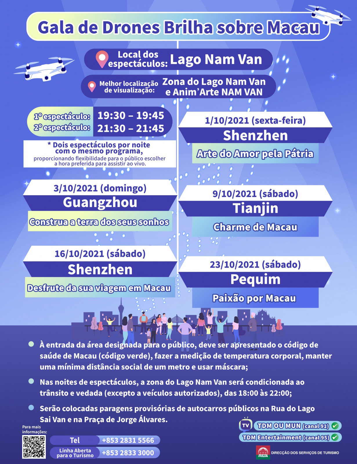A “Gala de Drones Brilha sobre Macau”, organizada pela primeira vez pela Direcção dos Serviços de Turismo (DST), que decorrerá entre 1 e 23 de Outubro na zona do Lago Nam Van, apresentará cinco temas: “Arte do Amor pela Pátria”, “Construa a terra dos seus sonhos”, “Charme de Macau”, “Desfrute da sua viagem em Macau” e “Paixão por Macau”. O evento integrará tecnologia com arte e cultura, realçando o ambiente festivo de Macau, e enquanto cidade segura e apropriada para visitar, bem como a amizade e o intercâmbio entre Macau e as cidades do Interior da China, celebrando com os residentes e visitantes os feriados pelo Dia Nacional e fins de semana.