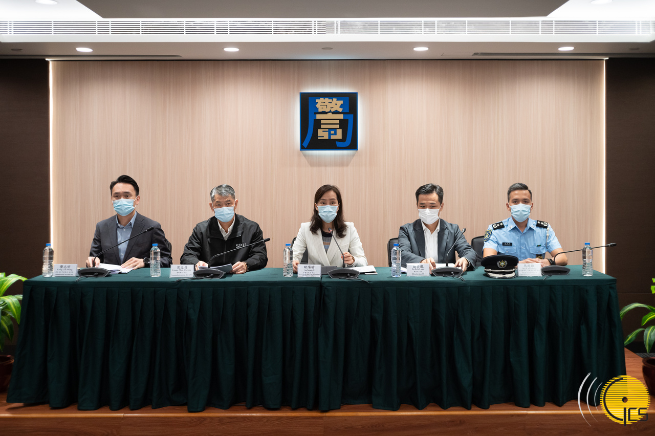 A conferência de imprensa do Centro de Coordenação de Contingência do Novo Tipo de Coronavírus realizou-se, esta manhã, no Centro de Operações de Protecção Civil (COPC) no Pac On, com a presença da secretária para os Assuntos Sociais e Cultura, Ao Ieong U, do comandante-geral dos Serviços de Polícia Unitários, Leong Man Cheong, do director dos Serviços de Saúde, Lo Iek Long, do subdirector dos Serviços de Educação e de Desenvolvimento da Juventude, Kong Chi Meng, do chefe da Divisão de Operações e Comunicações do Corpo de Polícia de Segurança Pública, Ma Chio Hong.