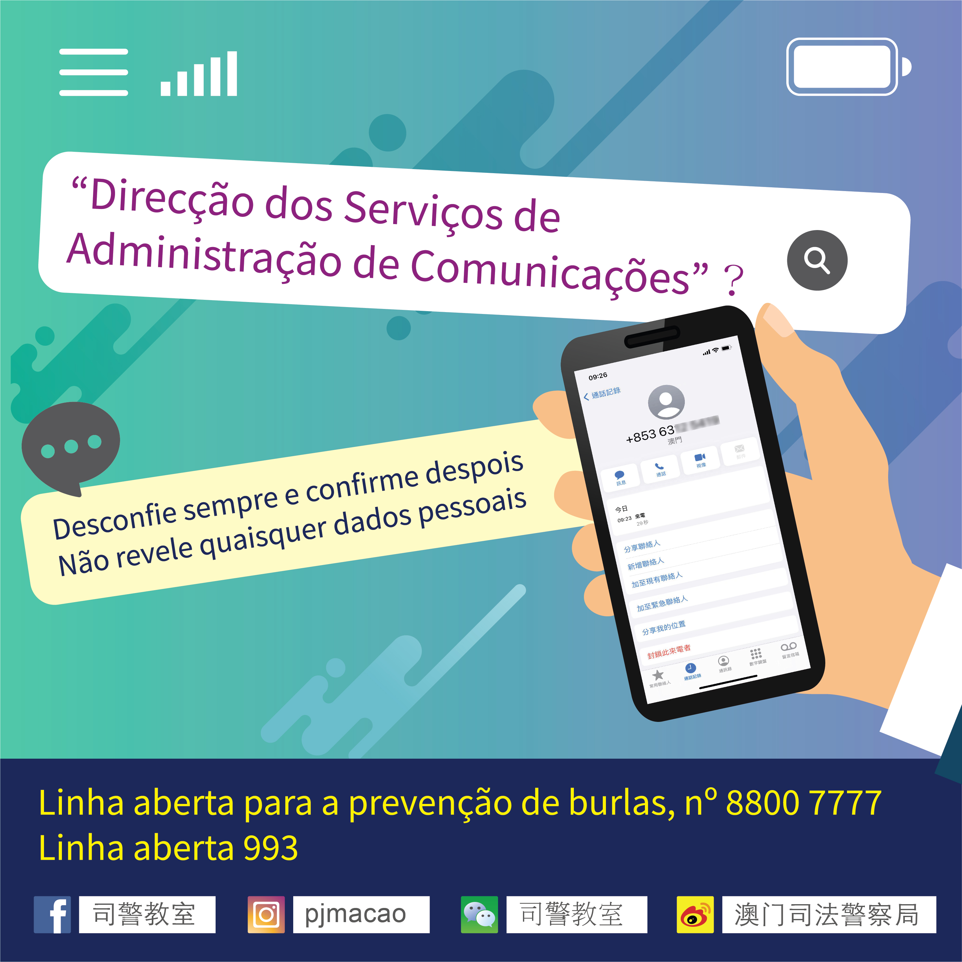 Recentemente, a PJ foi informada por um membro do projecto “Amigos da Prevenção Criminal para Mulheres”, que tinha recebido uma mensagem em Cantonês, através de uma chamada telefónica com um número de telemóvel de Macau. Segundo aquela gravação, tratava-se de uma chamada da “Direcção dos Serviços de Administração de Comunicações”, e dizia que o telemóvel da vítima tinha alguma anomalia e que portanto suspender o serviço, dizia ainda que para mais informações podia digitar “2”. Aquela pessoa suspeitou da chamada, desligou imediatamente e reportou o caso à polícia.