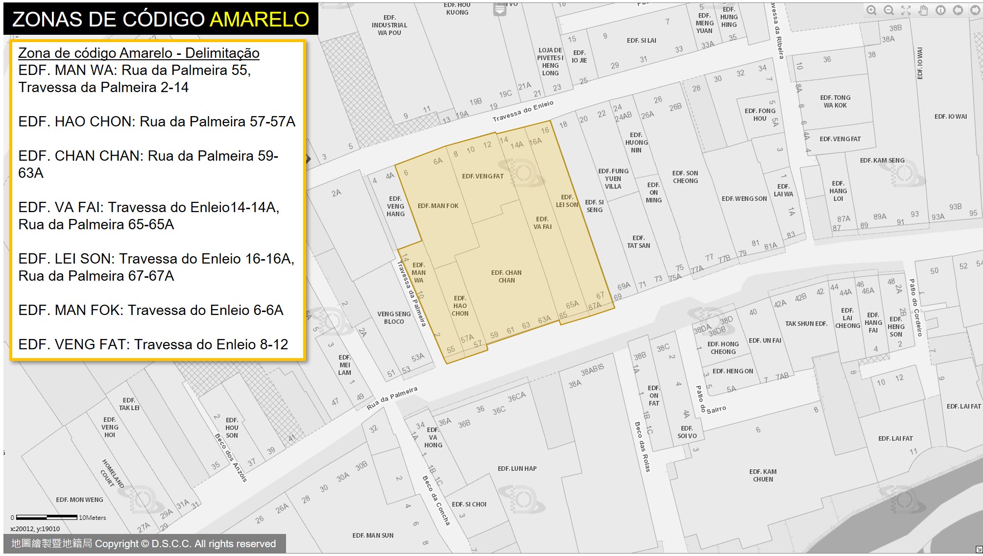 1)Travessa da Palmeira 2-14, Rua da Palmeira 55, ED-F. MAN WA; Rua da Palmeira 57 – 57A, EDF. HAO CHON; Rua da Palmeira 59- 63A, EDF.Chan Chan; Rua da Palmeira 65-65A; Travessa do Enleio 14 – 14A, EDF. VA FAI; Rua da Palmeira 67-67A; Travessa do Enleio 16 – 16A, EDF. LEI SON; Travessa do Enleio 6 – 6A, EDF. MAN FOK; Travessa do Enleio 8 – 12,EDF. VENG FAT.