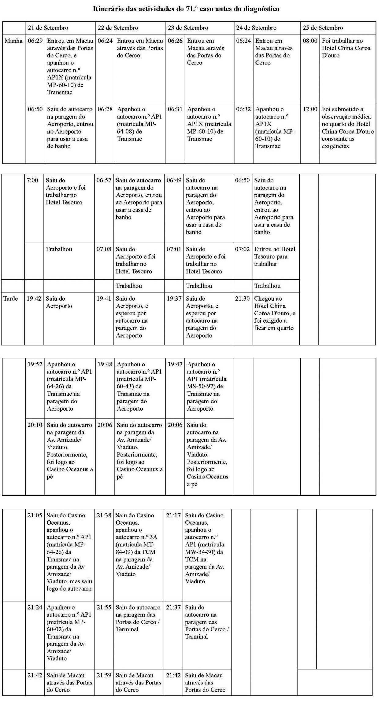 O 71.º caso, homem de 38 anos, com nacionalidade chinesa, no dia 21 de Setembro, entrou em Macau através das Portas do Cerco às 06:29, e apanhou o autocarro n.º AP1X (MP-60-10) da Transmac;