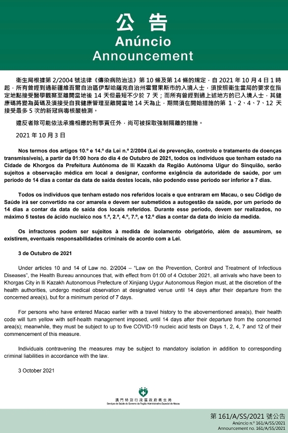 O Centro de Coordenação de Contingência do Novo Tipo de Coronavírus informa que tendo em consideração a evolução epidemiológica mais actualizada na Região Autónoma Uigur do Sinquião, nos termos dos artigos 10.º e 14.º da Lei n.º 2/2004 (Lei de prevenção, controlo e tratamento de doenças transmissíveis), a partir da 1:00 hora do dia 4 de Outubro de 2021, todos os indivíduos que tenham estado na Cidade de Khorgos da Prefeitura Autónoma de Ili Kazakh da Região Autónoma Uigur do Sinquião, serão sujeitos a observação médica em local a designar, conforme exigência da autoridade de saúde, por um período de 14 dias a contar da data de saída deste local, não podendo esse período ser inferior a 7 dias.