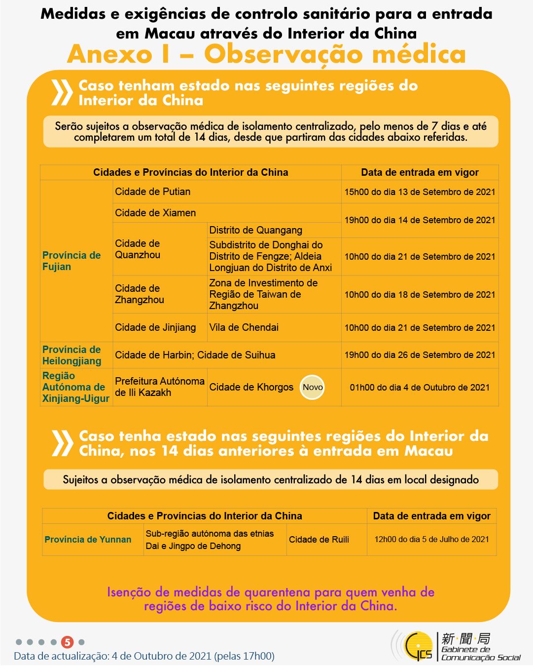 • Medidas mais recentes de entrada e saída de Macau - actualização de 6 de Outubro