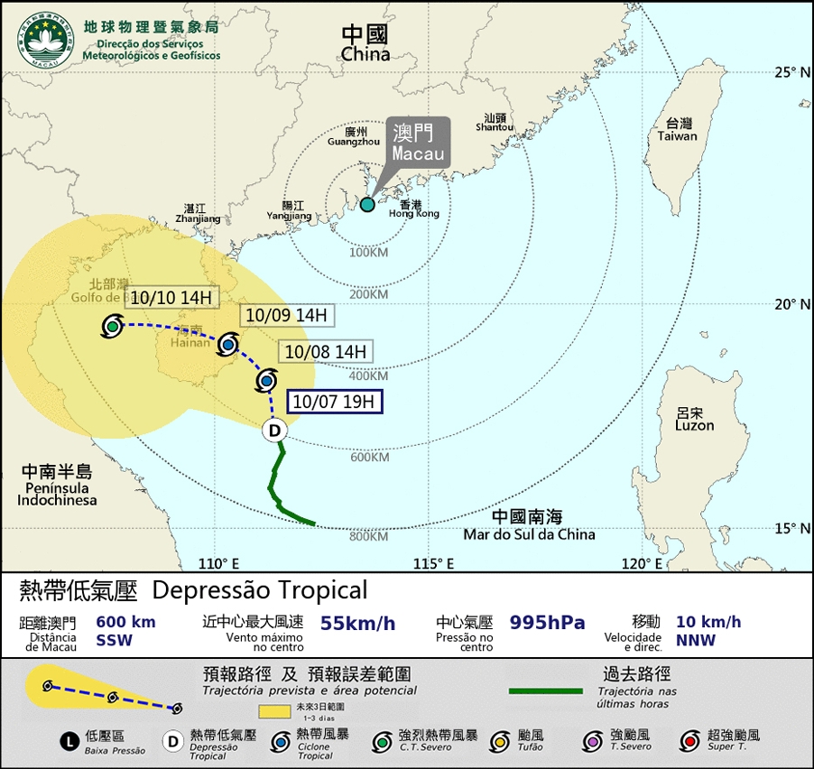 A circulação da depressão tropical localizada na parte setentrional do Mar do Sul da China é relativamente vasta e desenvolveu outro centro no mar sudeste da Ilha de Hainan. Deste modo, a trajectória está mais perto de Macau do que o inicialmente previsto e, nos próximos dias, o sistema vai passar num raio de cerca de 400 km a sudoeste de Macau, deslocando-se geralmente para a área compreendidada entre a Ilha de Hainan e a Península de Leizhou. Sob a influência da depressão tropical e da monção nordeste, espera-se que a partir de sexta-feira, o tempo na região se torne instável, havendo aguaceiros fortes e o vento se intensifique. Devido à influência da maré astronómica, no final desta semana, vão ocorrer inundações em zonas do Porto Interior.