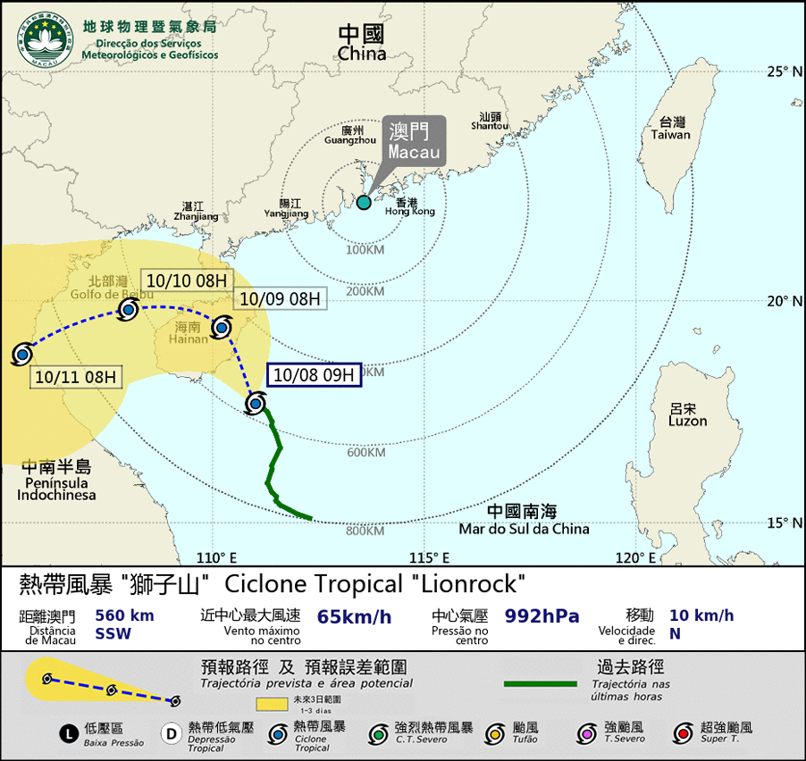 A depressão tropical localizada na parte setentrional do Mar do Sul da China intensificou-se para um ciclone tropical e foi denominado “Lionrock”. A circulação do ciclone tropical é relativamente vasta e a trajectória está mais perto de Macau do que o inicialmente previsto. Espera-se que entre a noite do dia 8 e o início da manhã do dia 9, o ciclone tropical passe num raio de cerca de 500 km a sudoeste de Macau, deslocando-se geralmente para a área compreendida entre a Ilha de Hainan e a Península de Leizhou. Sob a influência do “Lionrock” e da monção nordeste, espera-se que nos próximos dias, o tempo na região continue a ser instável, havendo aguaceiros fortes e que o vento se intensifique. O sinal n.o 3 de tempestade tropical continua em vigor por um período. Devido à influência da maré astronómica e do vento forte, nos próximos dias, vão ocorrer inundações em zonas do Porto Interior. Além disso, outra área de baixa pressão desenvolveu-se para uma depressão tropical no oeste do Oceano Pacífico, a leste das Filipinas, e deve se aproximar do Estreito de Luzon no início da próxima semana. Esta Direcção continua a acompanhar a sua evolução e aconselha à população a seguir as informações meteorológicas mais recentes.