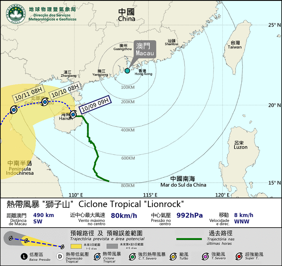 O sinal n.o 8 continua em vigor. Às 10:00 horas, o ciclone tropical estava a cerca de 480 km a sudoeste de Macau, deslocando-se geralmente para o Golfo “Beibu”. O “Lionrock” tomou um rumo mais para norte e o efeito da monção nordeste foi mais intenso do que o esperado. Deste modo, esta manhã, o vento na região vai intensificar-se. O vento forte vai afectar ocasionalmente Macau e pode atingir o nível 7 – 8 da escala de “Beaufort”, com aguaceiros fortes acompanhados de trovoadas.