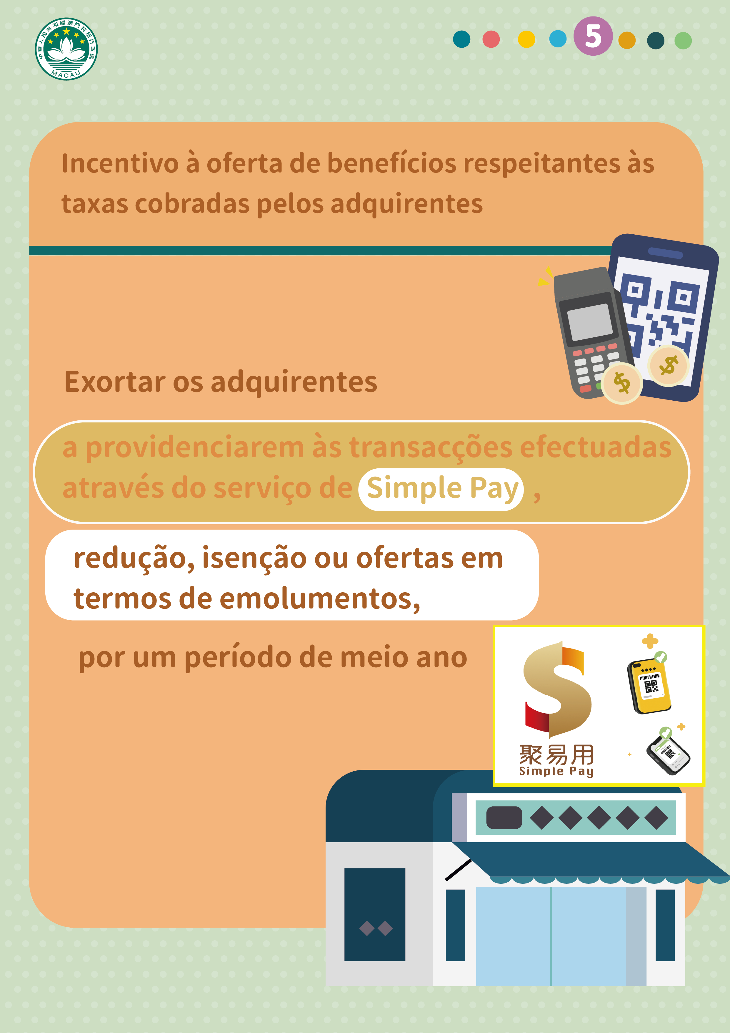 A AMCM incentiva as instituições financeiras aderentes ao serviço de Simple Pay a providenciarem, por um período de meio ano, redução, isenção ou ofertas em termos de emolumentos dos adquirentes cobrados sobre as transacções das PME feitas através de Simple Pay, a fim de reduzir os custos dos estabelecimentos comerciais.