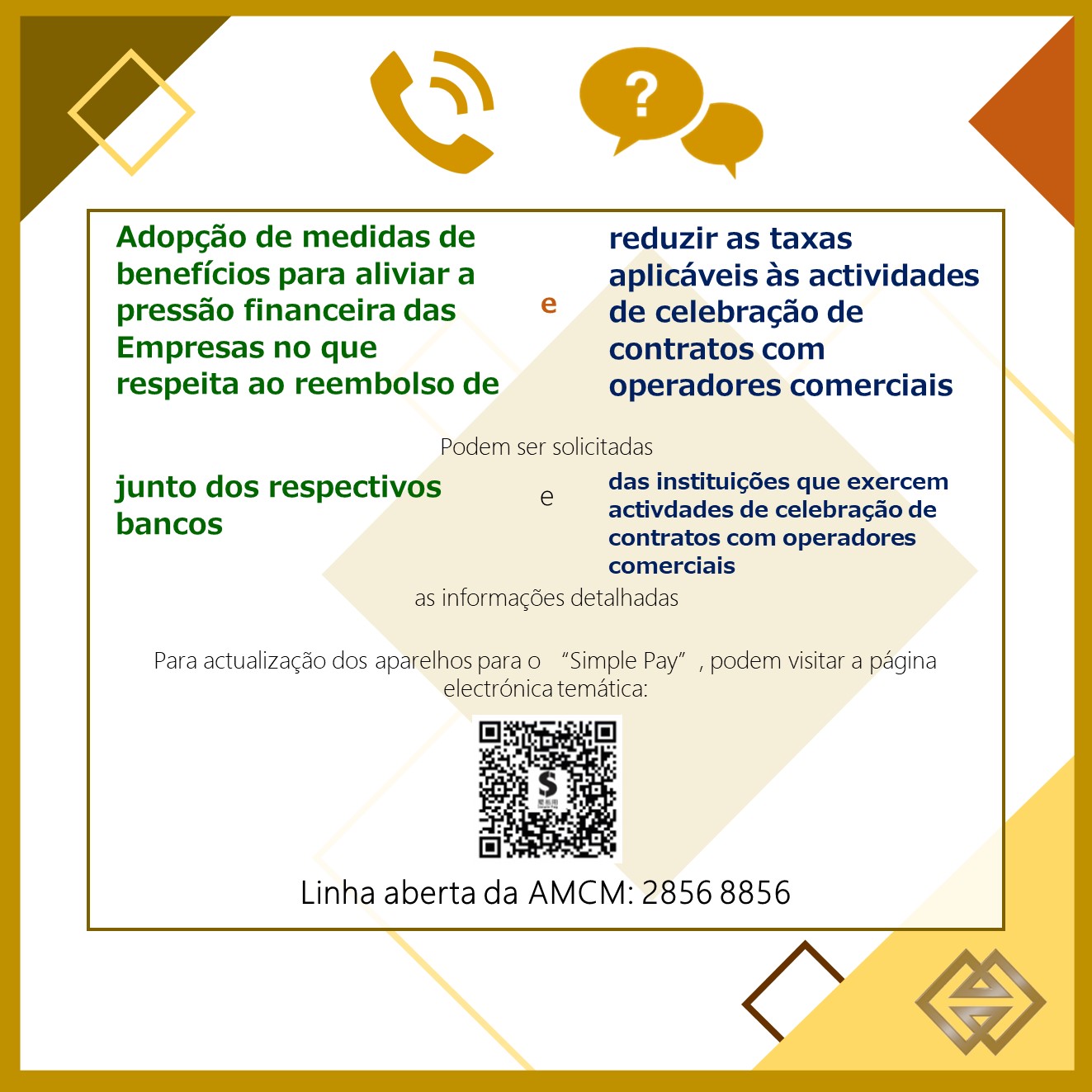 A AMCM manifesta agradecimentos aos bancos pela prestação da cooperação proactiva para superar as dificuldades com que as PMEs e o público se confrontam. No âmbito do programa, foi estabelecida uma linha direta para consulta ( 2856 8856 ), podendo os residentes ligar para esta linha e colocar perguntas, em caso de necessidade.