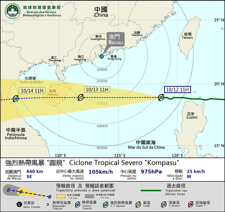 Prevê-se que hoje e amanhã, o “Kompasu”continue a intensificar-se e atravesse a parte setentrional do Mar do Sul da China. Entre a madrugada e o início da manhã de amanhã o sistema vai cruzar o ponto mais próximo da região, a cerca de 400 km a sul de Macau, deslocando-se, genericamente, para a Ilha de “Hainan”.