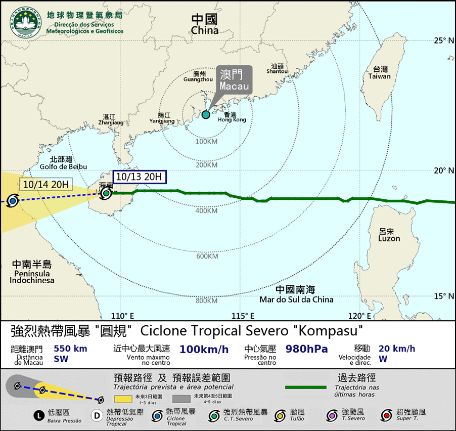 “Kompasu” está cruzando a Ilha de Hainan e entrará no Golfo de Beibu. Sob a influência da circulação externa associada, o tempo na região continua a ocorrer os aguaceiros e as trovoadas. O vento pode ocasionalmente atingir o nível 6 a 7 da escala “Beaufort” com rajadas.