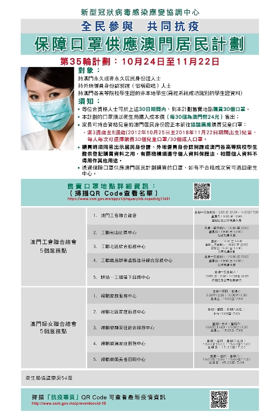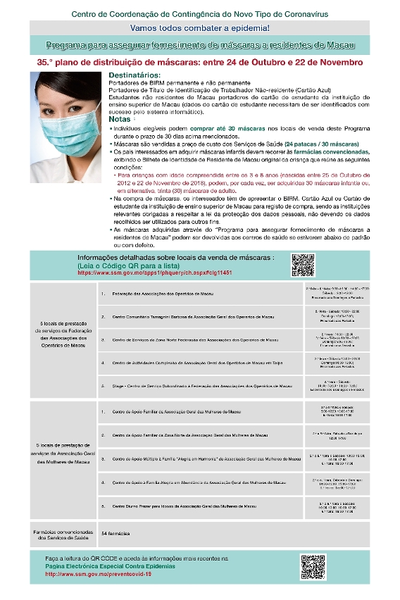 O Centro de Coordenação de Coordenação de Contingência do Novo Tipo de Coronavírus informa que no próximo dia 24 de Outubro, Domingo, terá inicio o 35.º Plano de fornecimento de máscaras destinado aos residentes de Macau. O período de venda irá decorrer durante 30 dias, entre 24 de Outubro e 22 de Novembro de 2021.