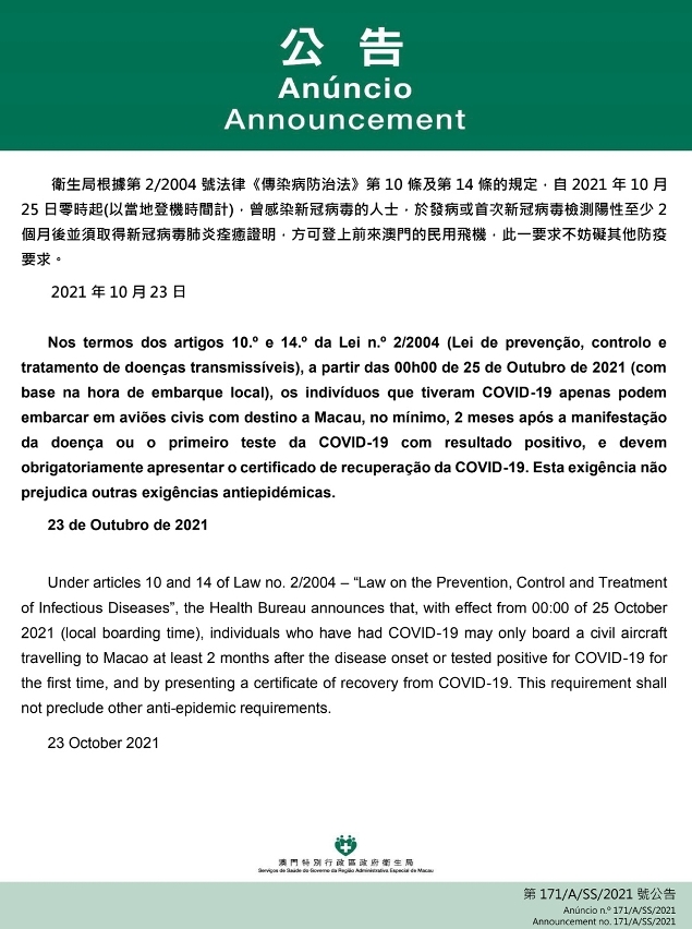 Face à necessidade de prevenção e controlo da epidemia, os Serviços de Saúde, de acordo com os dispostos nos artigos 10.º e 14.º da Lei n.º 2/2004 «Lei de Prevenção, Controlo e Tratamento de Doenças Transmissíveis», determinam que a partir das 00h00 de 25 de Outubro de 2021 (com base na hora de embarque local), os indivíduos que tiveram COVID-19 apenas podem embarcar em aviões civis com destino a Macau, no mínimo, 2 meses após a manifestação da doença ou o primeiro teste da COVID-19 com resultado positivo, e devem obrigatoriamente apresentar o certificado de recuperação da COVID-19. Esta exigência não prejudica outras exigências antiepidémicas.