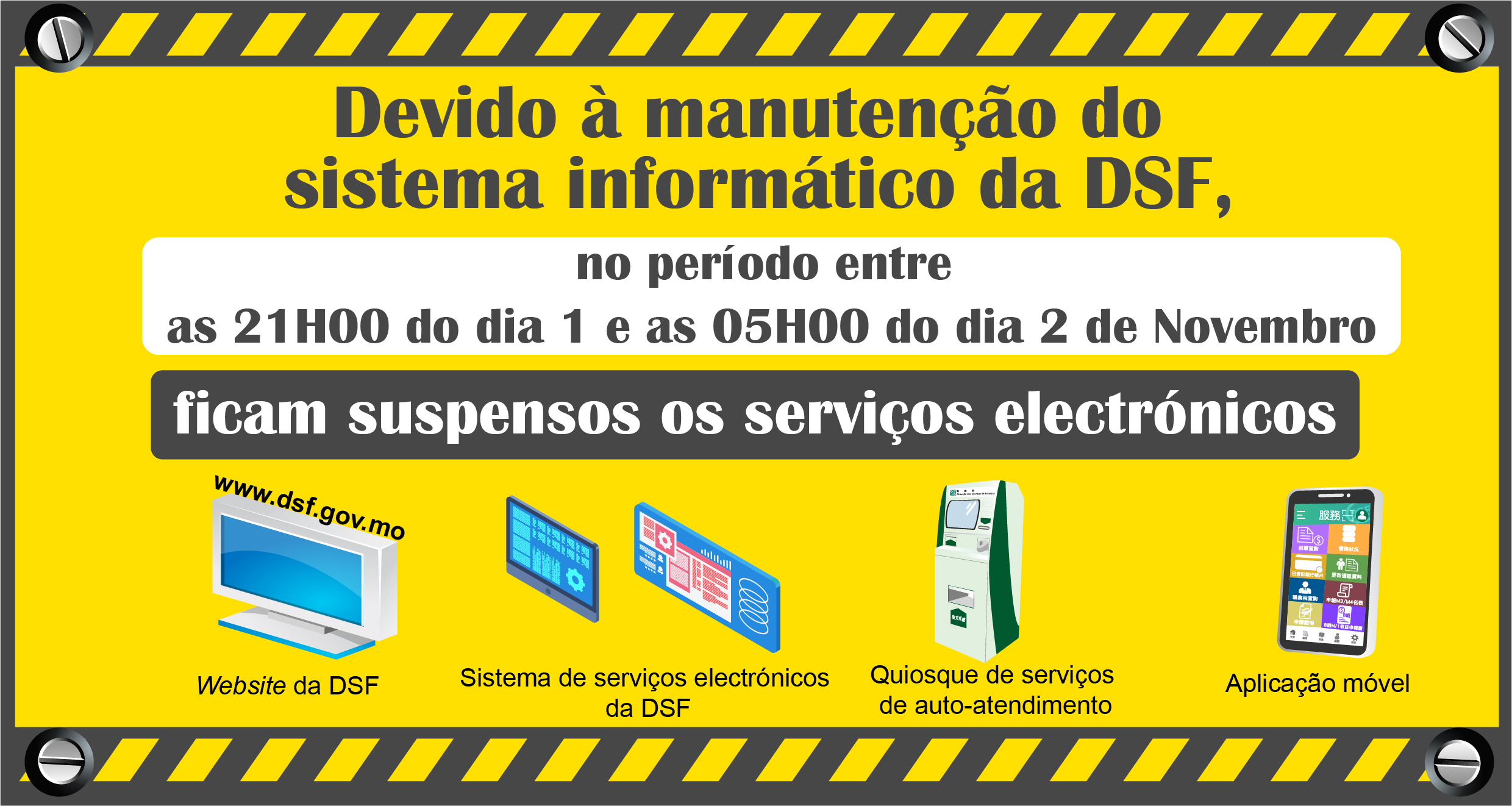A Direcção dos Serviços de Finanças irá proceder à manutenção do sistema informático, suspendendo os seguintes serviços electrónicos no período entre as 21H00 do dia 1 e as 05H00 do dia 2 de Novembro. Solicitamos a vossa compreensão pela inconveniência causada.