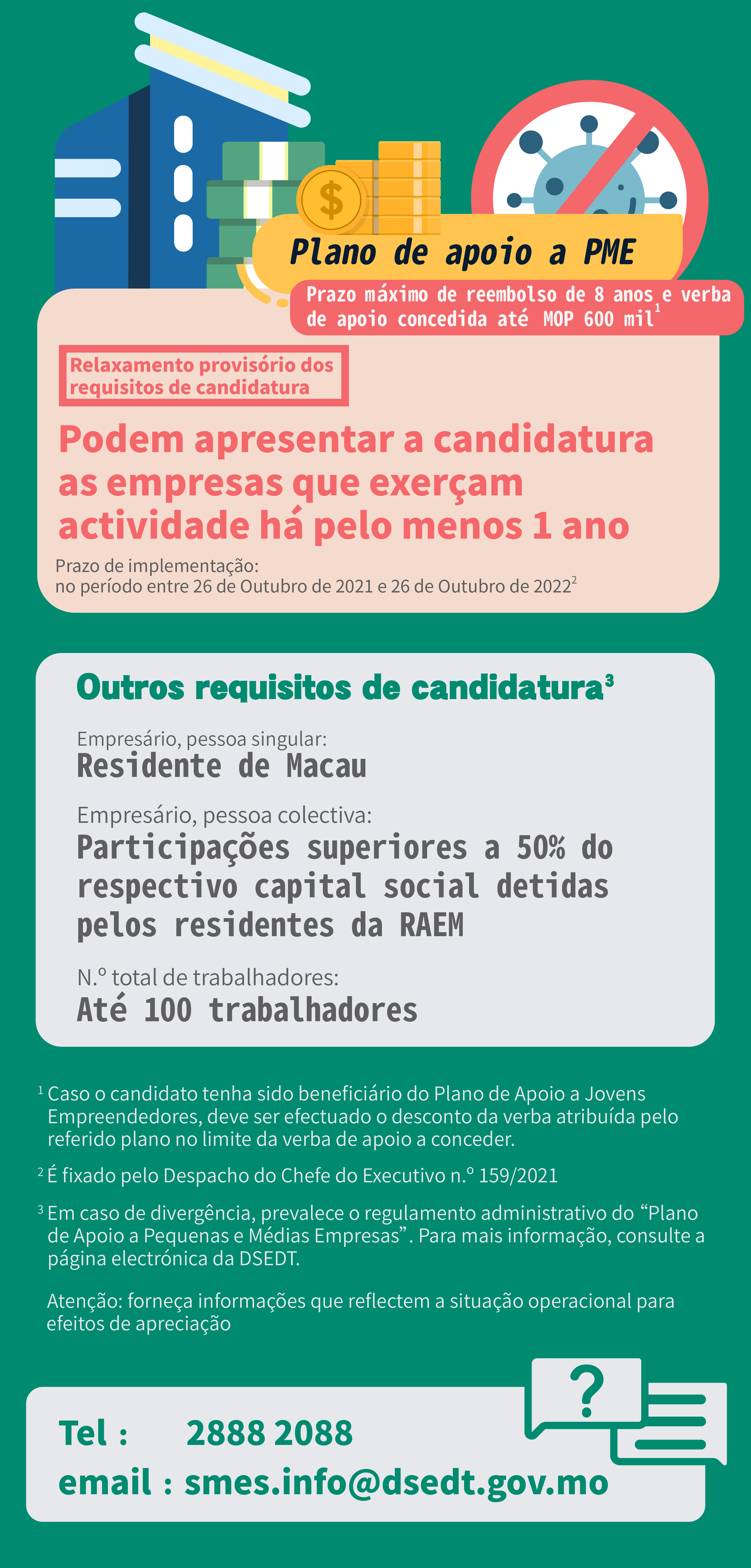 Para mais informações sobre as medidas de apoio às PME, podem contactar a DSEDT através do telefone 2888 2088, durante o horário de funcionamento, ou através do e-mailsmes.info@dsedt.gov.mo, ou através da conta de WeChat “DSEDTONLINE”.