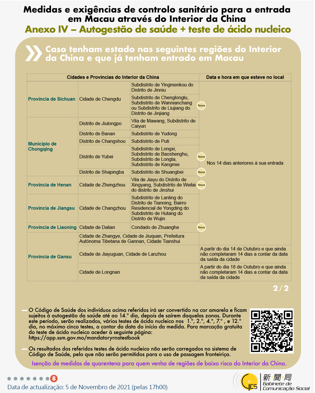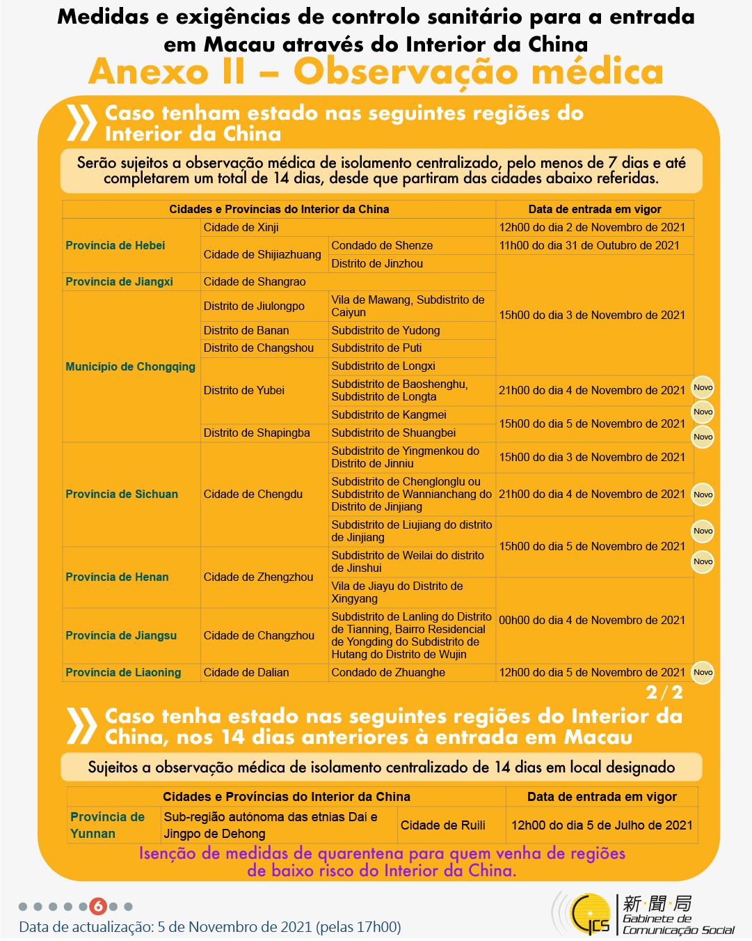 (Infografia)Medidas e exigências de controlo sanitário para a entrada em Macau de indivíduos de diferentes identidades, actualizadas no dia 5 de Novembro de 2021