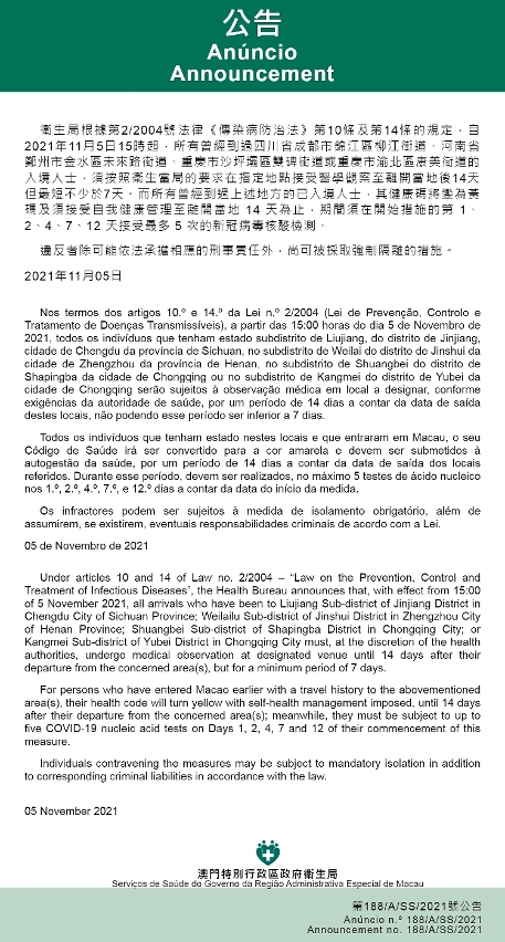 O Centro de Coordenação de Contingência do Novo Tipo de Coronavírus informa que tendo em consideração a evolução epidemiológica mais actualizada da Província de Sichuan e do Município de Chongqing, os Serviços de Saúde, de acordo com os dispostos nos artigos 10.º e 14.º da Lei n.º 2/2004 (Lei de Prevenção, Controlo e Tratamento de Doenças Transmissíveis), determinam que a partir das 15:00 horas do dia 5 de Novembro de 2021, todos os indivíduos que tenham estado no subdistrito de Liujiang, do distrito de Jinjiang, cidade de Chengdu da província de Sichuan, no subdistrito de Weilai do distrito de Jinshui da cidade de Zhengzhou da província de Henan, no subdistrito de Shuangbei do distrito de Shapingba da cidade de Chingqing ou no subdistrito de Kangmei do distrito de Yubei da cidade de Chongqing serão sujeitos à observação médica em local a designar, conforme exigências da autoridade de saúde, por um período de 14 dias a contar da data de saída destes locais, não podendo esse período ser inferior a 7 dias.
