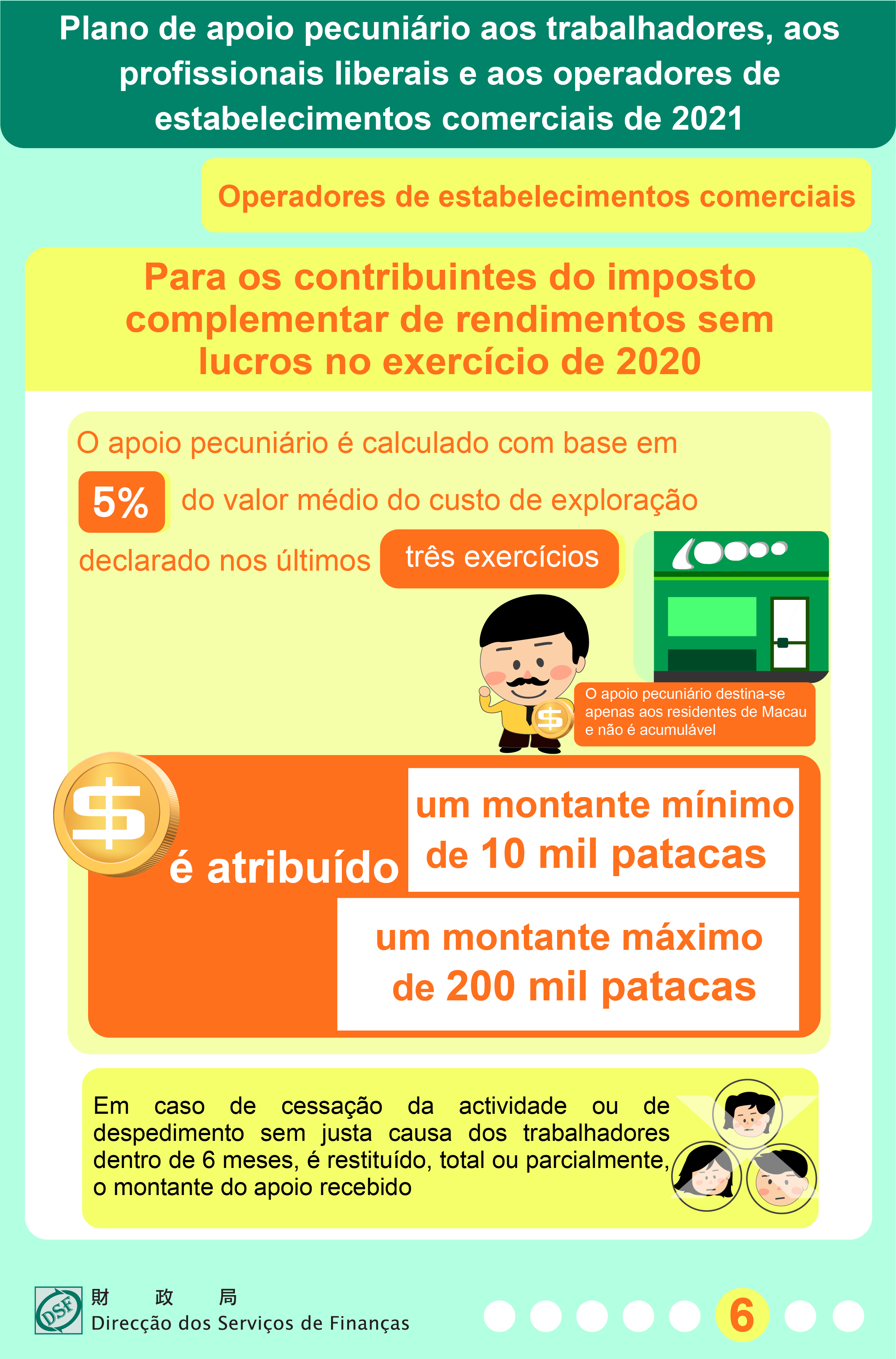 Aos contribuintes do imposto complementar de rendimentos que tenham efectuado o registo na DSF, não incluindo os não residentes de Macau, e declarado, relativamente aos resultados no âmbito do imposto complementar de rendimentos do exercício de 2020, um rendimento nulo referente ao exercício de actividade no seu estabelecimento comercial, o cálculo baseia-se em cinco por cento do valor médio do custo de exploração declarado nos últimos três exercícios do estabelecimento comercial, sendo o montante de apoio no mínimo de 10.000 patacas por pessoa e no máximo de 200.000 patacas por pessoa.