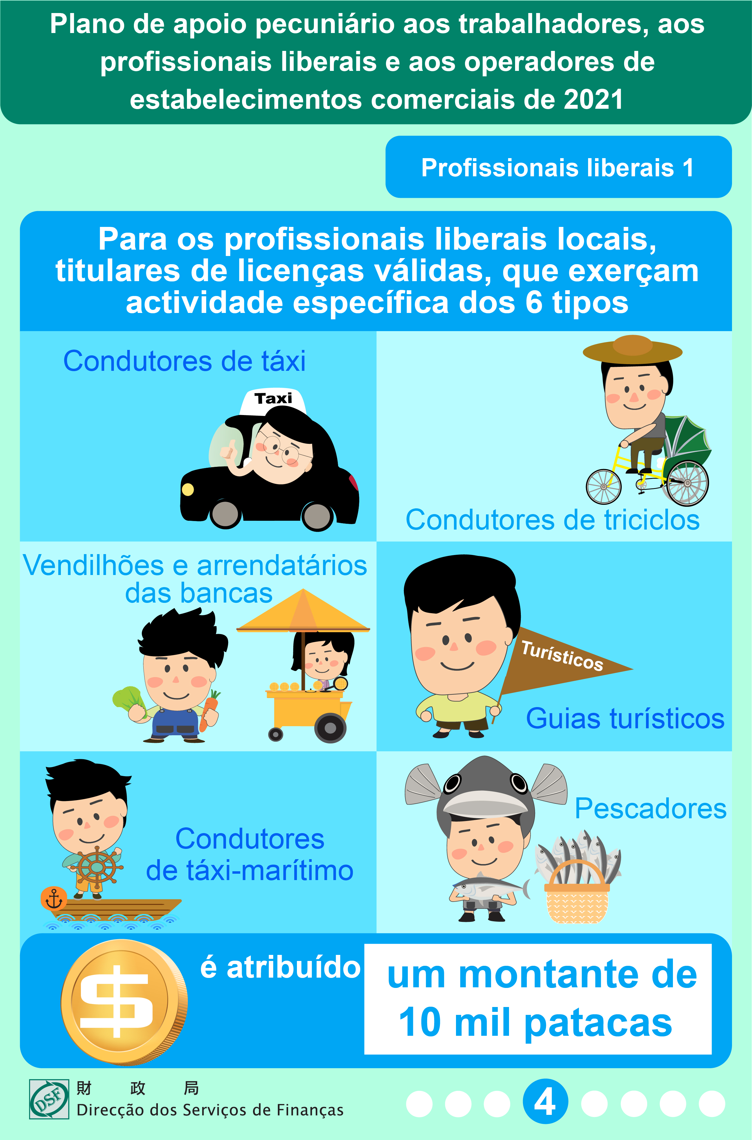 O primeiro tipo refere-se a profissionais liberais locais, titulares de licença válida, que exerçam actividade específica dos 6 tipos seguintes: condutores de táxi, condutores de triciclo, vendilhões e arrendatários das bancas, guias turísticos, condutores de táxi-marítimo e pescadores, sendo o respectivo montante a atribuir de 10.000 patacas por pessoa.