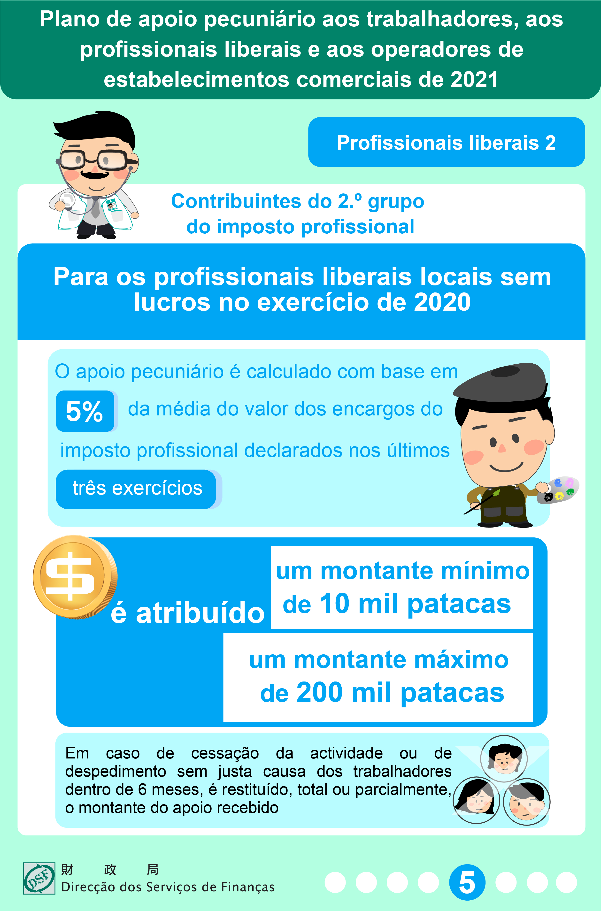 A fim de proteger os direitos e os interesses relativos ao emprego dos trabalhadores, os operadores de estabelecimentos comerciais e os profissionais liberais contribuintes do 2.º grupo do imposto profissional, que sejam beneficiários do apoio pecuniário, ficam sujeitos à devolução total ou parcial do montante do apoio recebido, em caso de cessação da actividade ou de despedimento sem justa causa dos mesmos dentro de 6 meses.