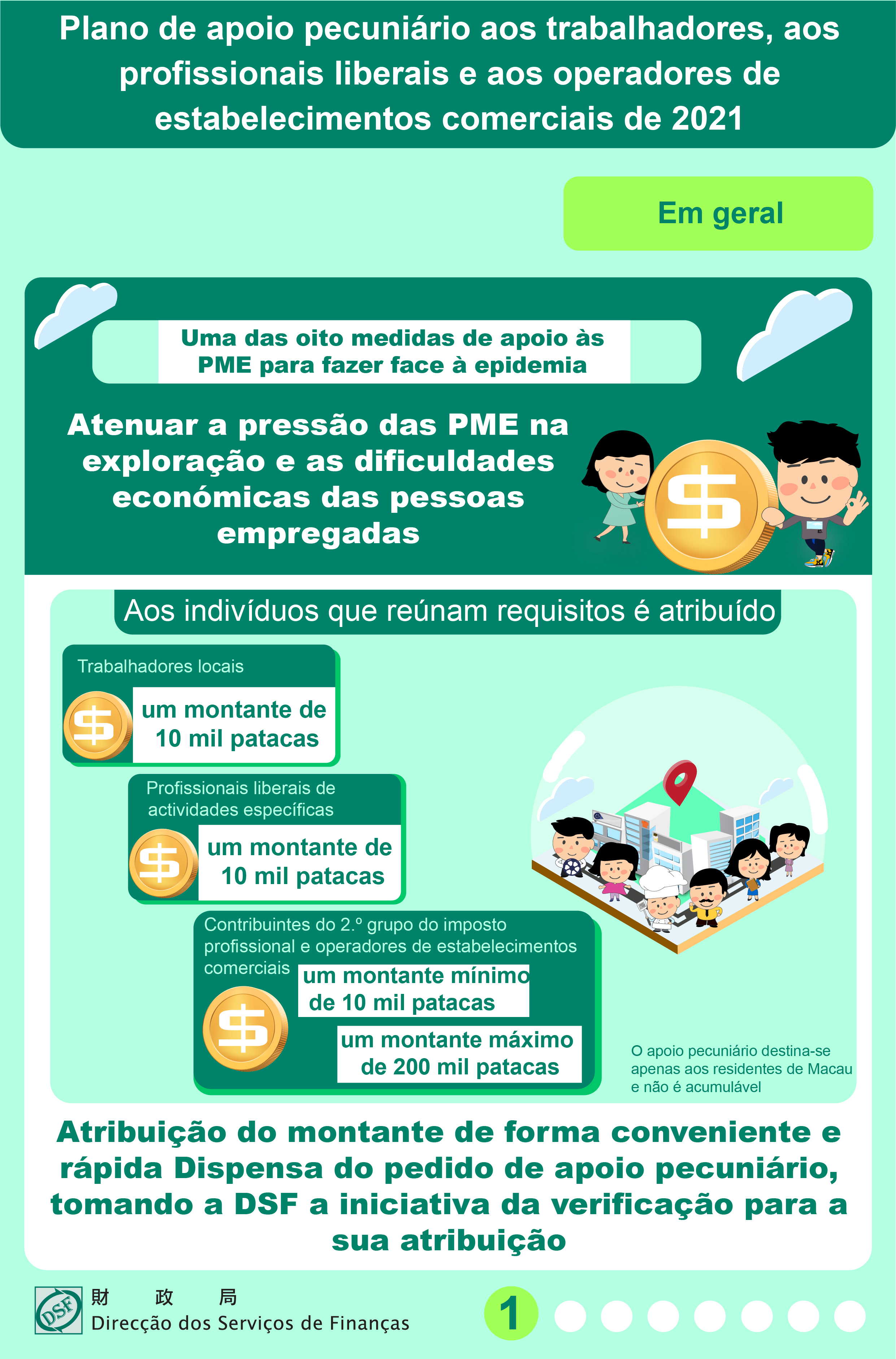 Na sequência da promoção, por parte do Governo da RAEM, das oito medidas de apoio às pequenas e médias empresas (PME) na situação de epidemia, vai ser atribuído, faseadamente e a partir de 26 de Novembro, o apoio pecuniário previsto no “Plano de apoio pecuniário aos trabalhadores, aos profissionais liberais e aos operadores de estabelecimentos comerciais para o ano de 2021” (adiante designado, simplesmente. por “plano de apoio”).