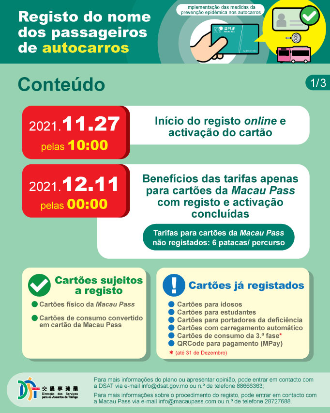 Em articulação com os trabalhos de prevenção epidémica e para facilitar o rastreamento dos passageiros que partilhem os percursos de autocarros com os casos confirmados do novo tipo de coronavírus, o Governo de RAEM, após comunicação e coordenação com a Macau Pass, S.A. e as duas operadoras de autocarros, decidiu implementar o plano de Registo do nome dos passageiros de autocarros, que vem regular o registo de todos os cartões da Macau Pass, utilizados nos autocarros públicos, com o nome do seu proprietário. Caso não seja efectuado o registo dos cartões da Macau Pass, a partir de 11 de Dezembro, os detentores deixarão de poder usufruir dos benefícios das tarifas.