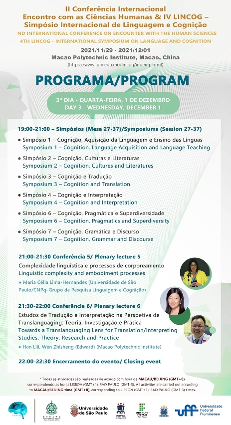 Para promover a interdisciplinaridade na área de investigação sobre “Cognição e Linguagem”, bem como outros estudos afins, considerando a construção da plataforma de intercâmbio e cooperação no que diz respeito às ciências humanas na Área da Grande Baía Guangdong-Hong Kong-Macau e no contexto das interações entre a China e os países de Língua Portuguesa, bem como entre a China e o mundo, através da Região Administrativa Especial de Macau (RAEM), a Escola Superior de Línguas e Tradução (ESLT) do Instituto Politécnico de Macau (IPM) e a Universidade de São Paulo (USP), em parceria com as instituições: Universidade Federal Fluminense (UFF), Universidade Federal Rural de Pernambuco (UFRPE) e Instituto Federal de São Paulo (IFSP) organizam em conjunto um evento académico on-line II Conferência Internacional Encontro com as Ciências Humanas & IV LinCog - Simpósio Internacional de Linguagem e Cognição que ocorrerá do dia 29 de novembro ao dia 1 de dezembro de 2021. O tema geral é “Cognição, língua, cultura e tradução: um diálogo sem fronteiras e interdisciplinar”. Os idiomas da conferência são: Português e Inglês.