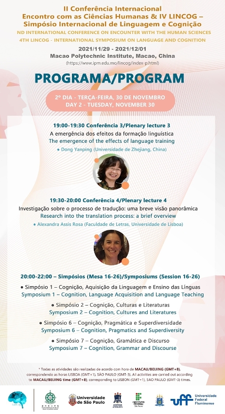 Para mais informações, consulte o site da Conferência https://www.ipm.edu.mo/lincog/index.html onde se encontra o Programa, o Livro de resumos e outras informações relacionadas.