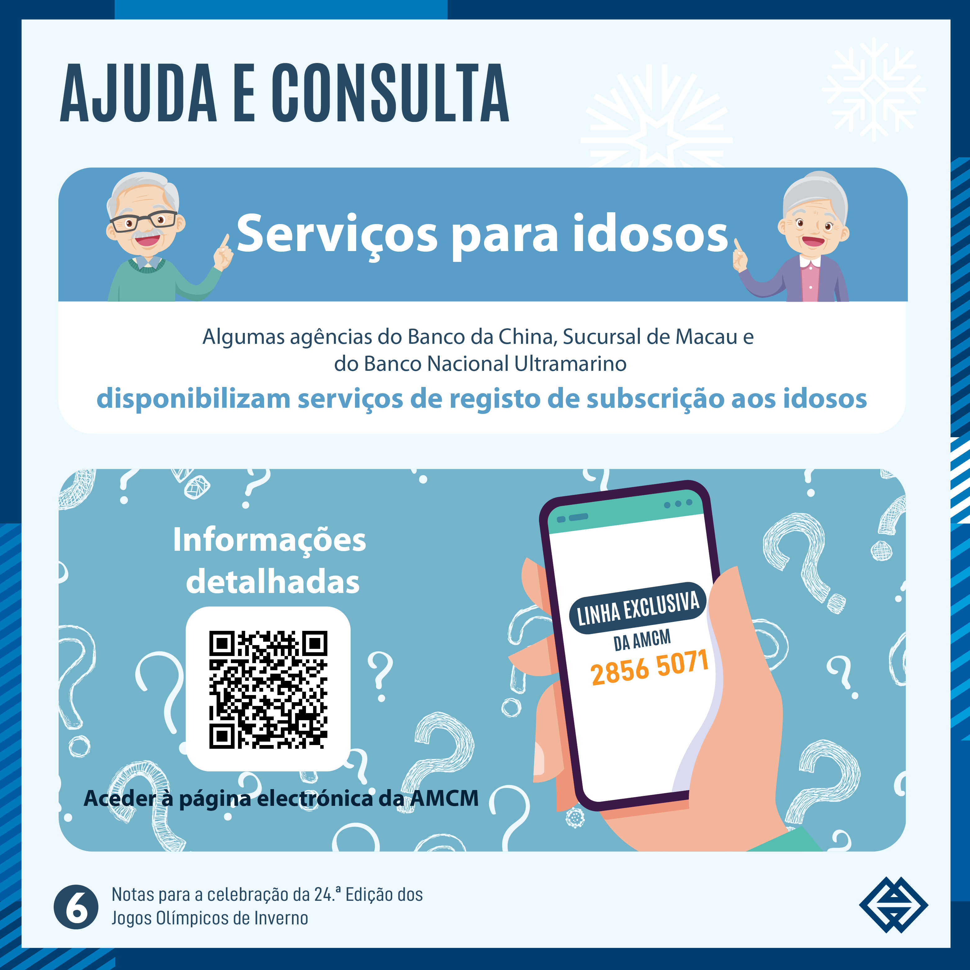Algumas agências do Banco da China, Sucursal de Macau e do Banco Nacional Ultramarino disponibilizarão serviços de registo de subscrição aos idosos. Para quaisquer esclarecimentos, favor contactar a linha exclusiva da AMCM: 2856 5071, ou a página electrónica da AMCM: