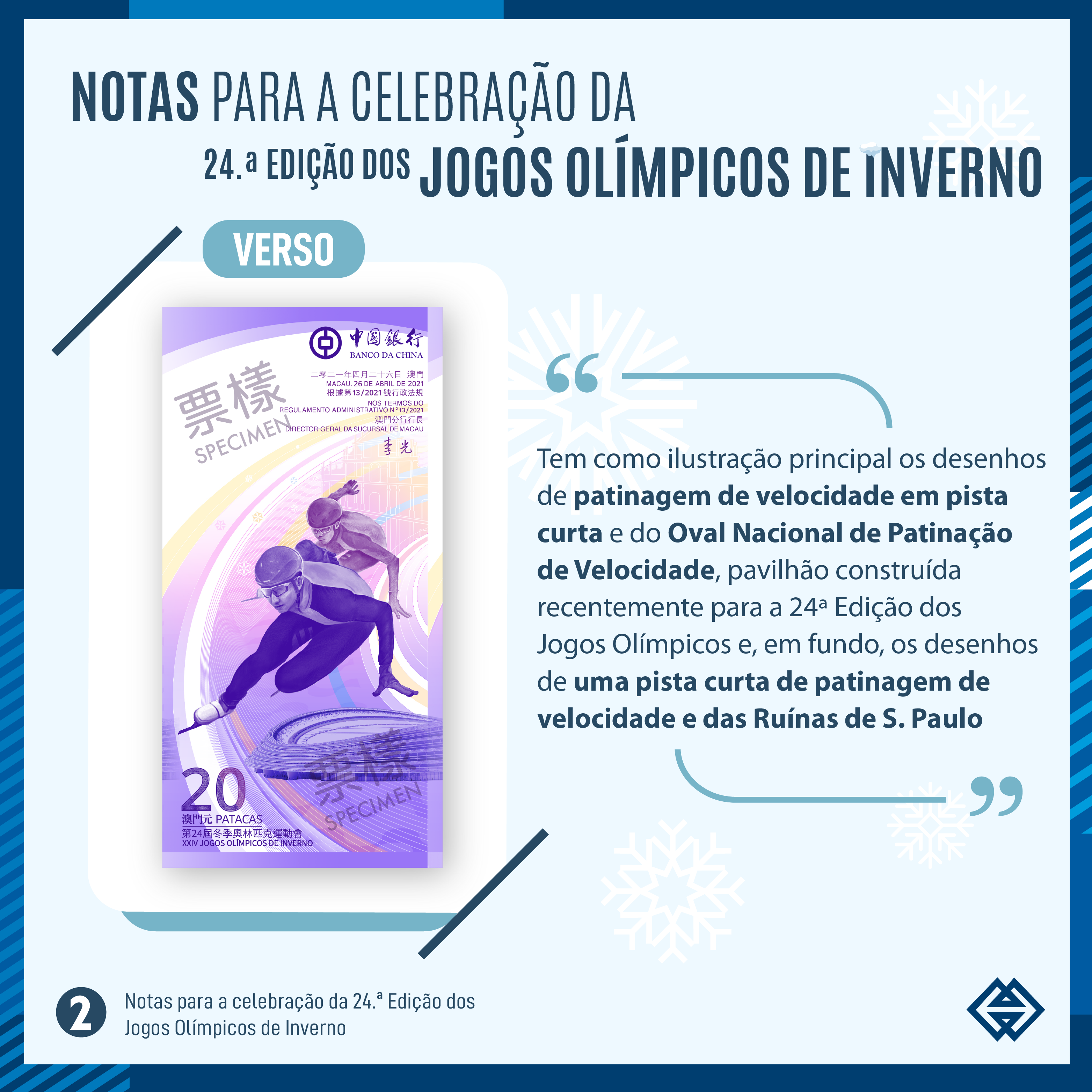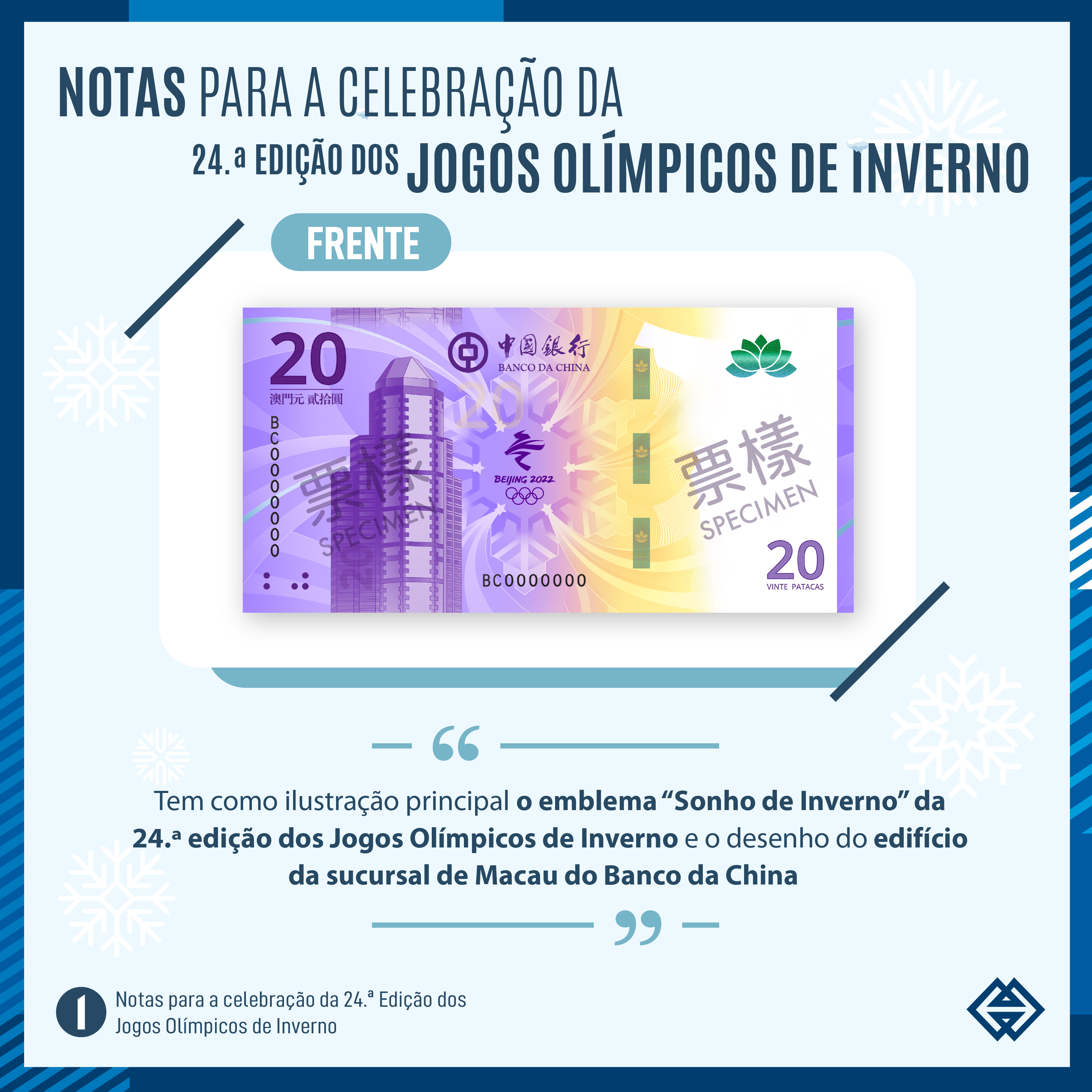 Nas notas para celebração da 24a Edição dos Jogos Olímpicos emitidas pelo Banco da China, a frente das notas tem como ilustração principal o emblema “Sonho de Inverno” da 24.ª Edição dos Jogos Olímpicos de Inverno e o desenho do edifício da sucursal de Macau do Banco da China. No verso, as notas têm como ilustração principal os desenhos de patinagem de velocidade em pista curta e do Oval Nacional de Patinação de Velocidade, pavilhão construída recentemente para a 24ª Edição dos Jogos Olímpicos e, em fundo, os desenhos de uma pista curta de patinagem de velocidade e das Ruínas de S. Paulo. O número de notas disponibilizadas para troca, por cada residente de Macau, é fixado em 2 (duas) unidades, com um valor de 40 patacas.