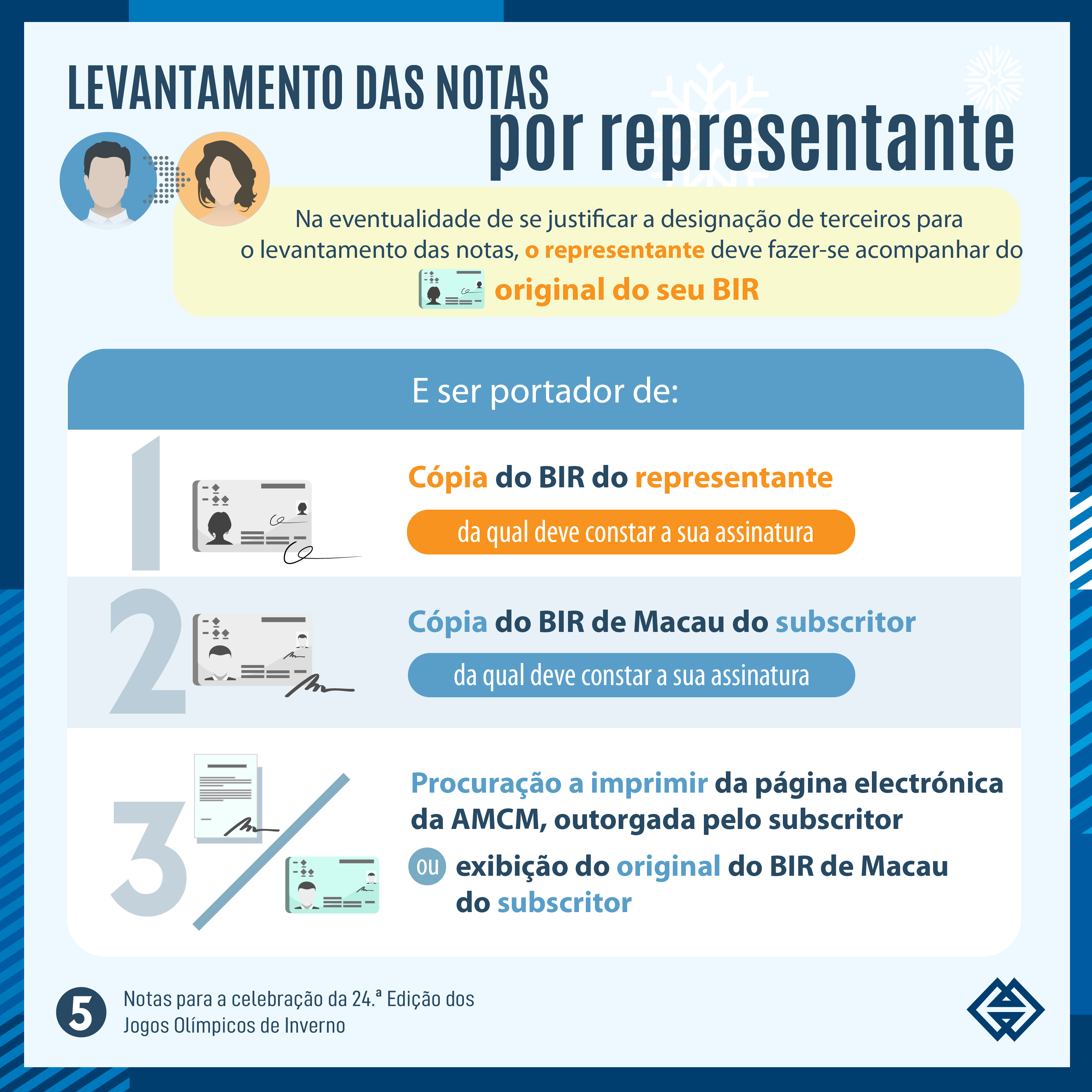 Na eventualidade de se justificar a designação de terceiros para o levantamento das notas, o representante deve fazer-se acompanhar do original do seu bilhete de identidade de residente e ser portador dos seguintes documentos: