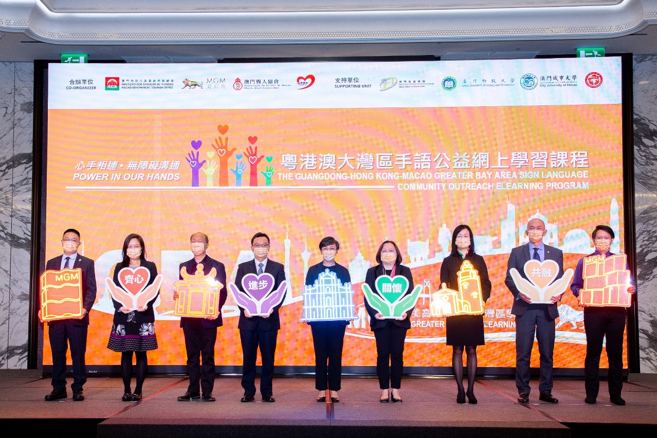 A cerimónia de lançamento de “O Poder nas suas Mãos - Programa comunitário de aprendizagem de língua gestual da Grande Baía via internet” e o “Simpósio de Turismo Acessível para Todos”, foram co-organizados pela DST, MGM, Associação de Surdos de Macau e Associação de Surdos de Guangdong, contando com o apoio do Instituto de Formação Turística, Universidade da Cidade de Macau, Universidade de Ciência e Tecnologia de Macau e Associação de Linguagem Gestual de Guangdong. A cerimónia de lançamento do programa e o simpósio contaram com a presença da directora da DST, Maria Helena de Senna Fernandes; do subdirector do Departamento para os Assuntos Sociais do Gabinete de Ligação do Governo Popular Central na RAEM, Zhao Heqing; da vice-presidente executiva do Departamento de Recursos Humanos da MGM, Wendy Yu; do secretário-geral da Associação para a Promoção de Acessibilidade sem Barreiras de Guangdong e vice-presidente da Associação de Cegos de Guangdong, Chen Yang; da presidente do Instituto de Formação Turística de Macau, Fanny Vong; da chefe da Divisão de Estudos e de Análise de Informação da Direcção de Inspecção e Coordenação de Jogos, Tou Chi Iau; do director da Faculdade de Hospitalidade e Gestão Turística da Universidade de Ciência e Tecnologia de Macau, Ben Goh; do director executivo associado da Faculdade Internacional de Gestão de Turismo da Universidade da Cidade de Macau, Li Xi; do presidente da Associação de Surdos de Macau, Sam Wong, entre outros.