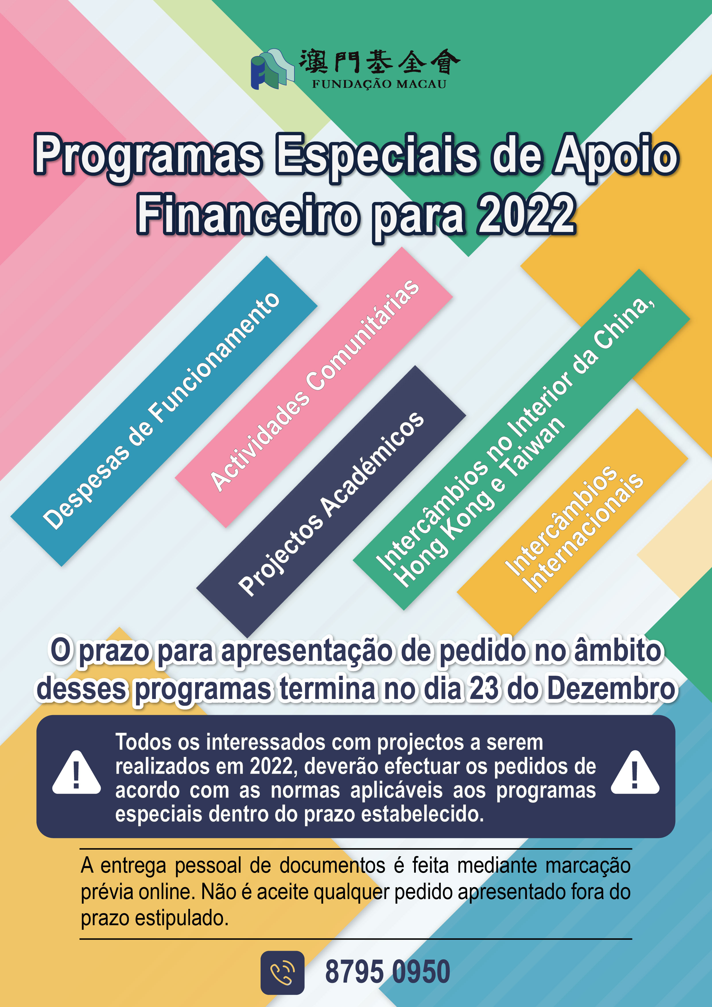 Para avançar com a reforma do regime de concessão de apoio financeiro e criar um mecanismo de apreciação e autorização ainda mais objectivo e equitativo, a FM anunciou recentemente o lançamento dos cinco programas de apoio supramencionados e frisou que a FM deixou de receber, durante todo o ano, pedidos de apoio financeiro e de proceder à “apreciação caso a caso sempre que recebe um pedido”, passando a receber e apreciar os pedidos de apoio financeiro de forma integrada de acordo com critérios uniformizados, com o objectivo de reforçar a precisão, a transparência e a eficácia dos apoios financeiros atribuídos, assegurando que os recursos públicos sejam aplicados exactamente nas acções que respondam de melhor forma às necessidades da sociedade. A FM adverte os interessados de que, neste momento, apenas podem ser apresentados pedidos de apoio financeiro para as despesas ou actividades a realizar em 2022 que se enquadram no âmbito de apoio dos cinco programas de apoio lançados e de que esses pedidos têm de ser apresentados o mais cedo possível, sempre dentro do prazo estipulado, não sendo aceite qualquer pedido apresentado fora deste prazo.
