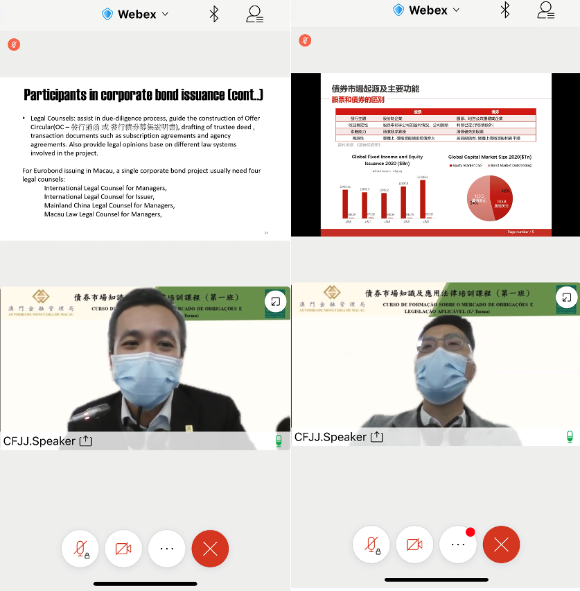 Neste curso foram convidados formadores do Interior da China, Macau, Hong Kong e Portugal, tendo o curso sido realizado através de ensino “on-line” e presencial. O conteúdo do curso abrangeu o mercado e as operações de obrigações, o desenvolvimento dos mercados de obrigações, bem como a respectiva legislação aplicável. Os formadores partilharam as suas experiências profissionais e trataram diversos casos concretos com os formandos, tendo sido efectuados intercâmbios e discussões sobre diversos temas, num ambiente de grande entusiasmo.